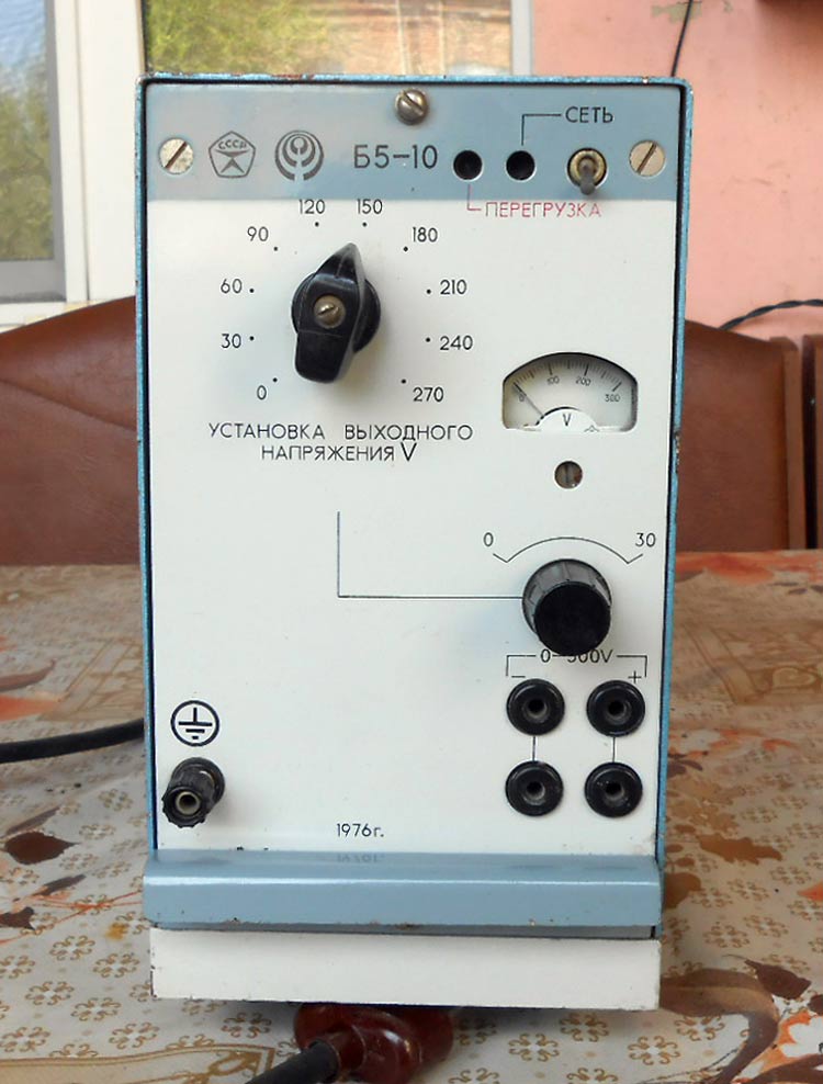 Источник питания постоянного тока *Б5-10* выпускался с 1972 года. Источник питания постоянного тока **Б5-10** предназначен для питания радиоэлектронных устройств стабилизированным напряжением постоянного тока. Выходное напряжение регулируется ступенчато и плавно в пределах от 0 до 300 вольт при токе нагрузки до 0,3 А.