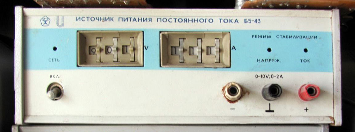 Источник постоянного тока *Б5-43* выпускался предположительно с 1983 года. Предназначен для питания разных радиотехнических устройств стабилизированным напряжением и током и лабораторных и цеховых условиях. Выходное напряжение от 0 до 10 В и сила тока от 0 до 2 А ступенчато регулируется. В зависимости от положения органов управления и величины тока ИПТ может работать в режимах стабилизации напряжения или тока. Переход режима происходит автоматически при превышении нагрузки (тока или напряжения) установленного значения, обеспечивая тем самым защиту источника питания и устройства от перегрузки.