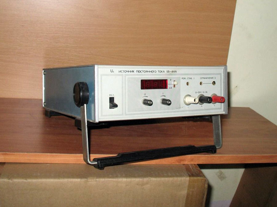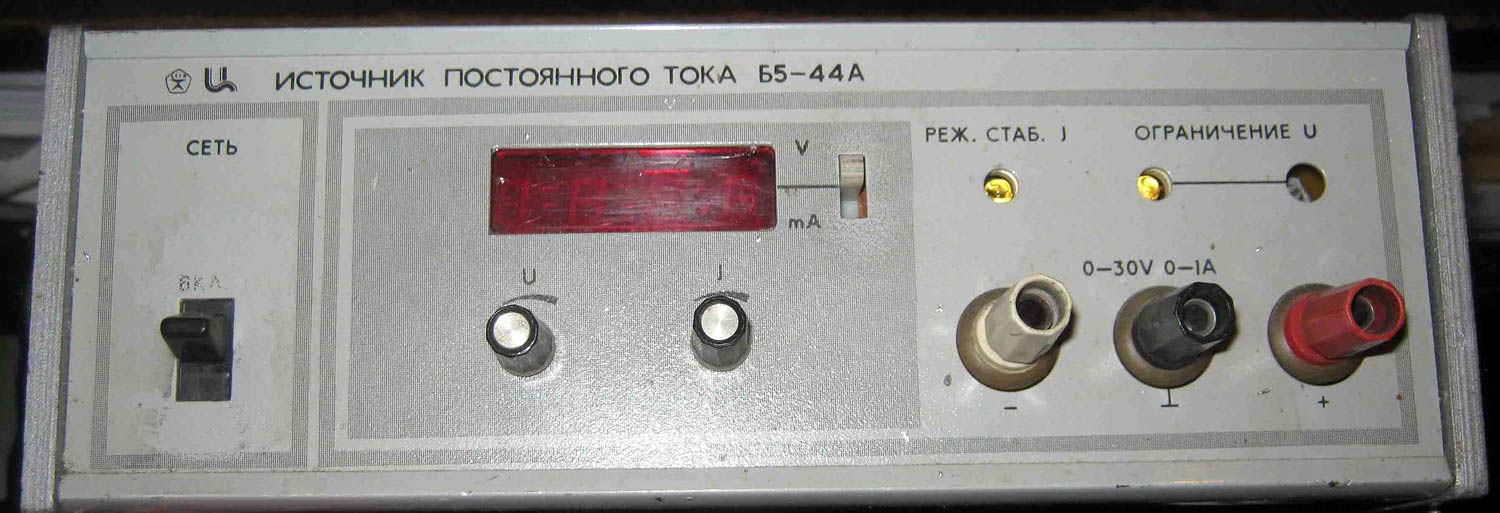 Источник питания стабилизированный *Б5-44А* выпускался с 1990 года. Источник питания *Б5-44А* применяется для стабилизации постоянного тока или напряжения (зависит от установленного режима). Переключение между режимами в ИП происходит автоматически, без вмешательства пользователя. На лицевой панели источника питания под шлиц выведен потенциометр, посредством которого устанавливается ограничение выходного напряжения. В ИП также реализована установка выходного напряжения и тока внешним аналоговым напряжением отрицательной полярности. Стабилизация напряжений и токов на выходе в источнике питания осуществляется линейным регулятором. Установка напряжения или тока осуществляется с фронтальной панели двухоборотным потенциометром и контролируется встроенным цифровым вольтметром.