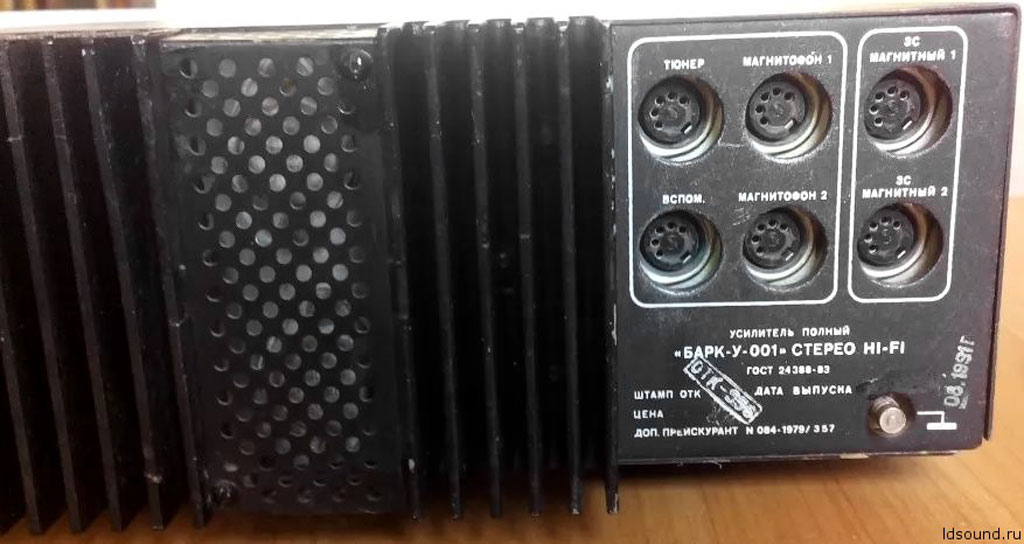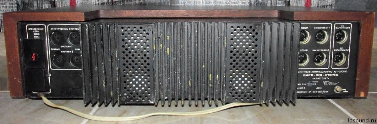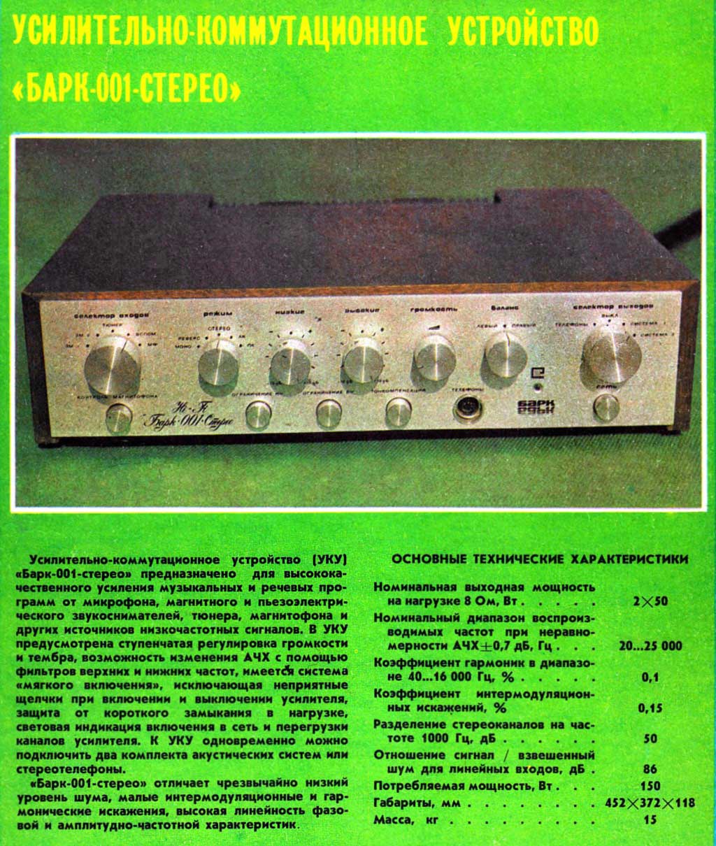 Усилительно-коммутационное устройство (УКУ) *Барк-001-стерео* с I-кв 1985 года выпускал Новокаховский ПСЗ *Сокол*. УКУ является аналогом УКУ *Бриг-001-стерео, выпускаемого ещё с 1975 года и предназначено для высококачественного усиления звуковых фонограмм. В УКУ имеется ступенчатая регулировка громкости и тембра с возможность изменения АЧХ с помощью фильтров верхних и нижних звуковых частот, имеется система мягкого включения исключающая щелчки при включении и выключении усилителя, защита от короткого замыкания в нагрузке, световая индикация включения в электрическую сеть и перегрузки каналов усилителя. К УКУ можно одновременно подключить два комплекта АС или же стереофонические головные телефоны. УКУ отличает низкий уровень шума, малые интермодуляционные и гармонические искажения, высокая линейность фазовой и АЧХ. Номинальная выходная мощность- 2х50 Вт. Диапазон воспроизводимых частот звука - 20...25000 Гц. Коэффициент гармоник - 0,1%. КНИ - 0,15%. Разделение стереофонических каналов на частоте 1000 Гц - 50 дБ. Отношение сигнал/взвешенный шум для ЛВ 86 дБ. Потребляемая от сети мощность 150 Вт. Габариты УКУ - 452х372х118 мм. Масса 15 кг.