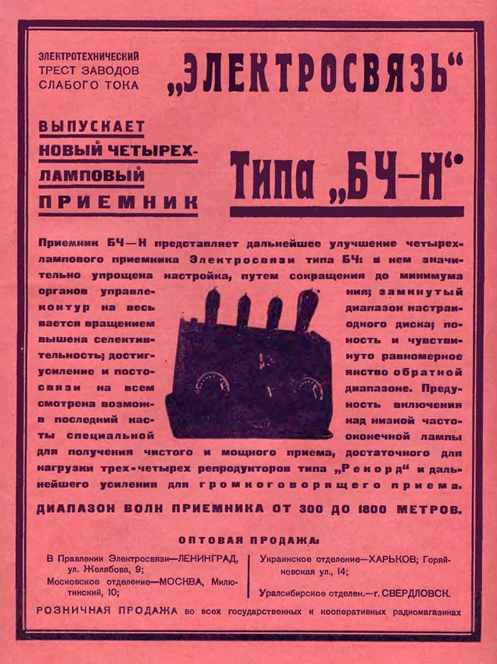 Радиоприёмник батарейный *БЧ-Н* с 1928 года выпускал Трест Заводов Слабого Тока, а конкретно Московский завод Мосэлектрик и Ленинградский завод имени Козицкого. *БЧ-Н* - более усовершенствованный тип радиоприёмника **БЧ**. Наименование **БЧ-Н**, расшифровывается как Борусевича Четырёхламповый, Настольный. Ещё радиоприёмник именовался как *ПЛ-4*. Четырехламповый регенеративный приёмник *БЧ-Н* собран по схеме 1-V-2. Сонтирован в ящике в виде изящного деревянного пульта. Диапазон волн 300...1850 метров. Плавная настройка антенного контура приёмника производится при помощи вариометра и настройка скачками - путем включения при помощи штепселя различных конденсаторов постоянной емкости. Настройка междулампового контура производится при помощи установленных на одной оси вариометра и конденсатора переменной емкости, перекрывающих весь диапазон при повороте на 180°. Обратная связь задается при помощи вариометра связи. Для включения повышенного анодного напряжения и сеточной батареи выведены специальные клеммы. В остальном приёмникподобен приёмнику БЧ, но более прост в управлении. При применении в последнем каскаде специальной лампы с повышенным до 160 вольт анодным напряжением, от приёмника можно нагрузить 2 или 3 громковорителя типа *Рекорд*. Цена радиоприёмника 36 рублей 23 копейки. С начала выпуска заводом *Мосэлектрик* приёмник именовался как *ПЛ-4*. С середины года приёмник был переименован в *БЧ-Н*.