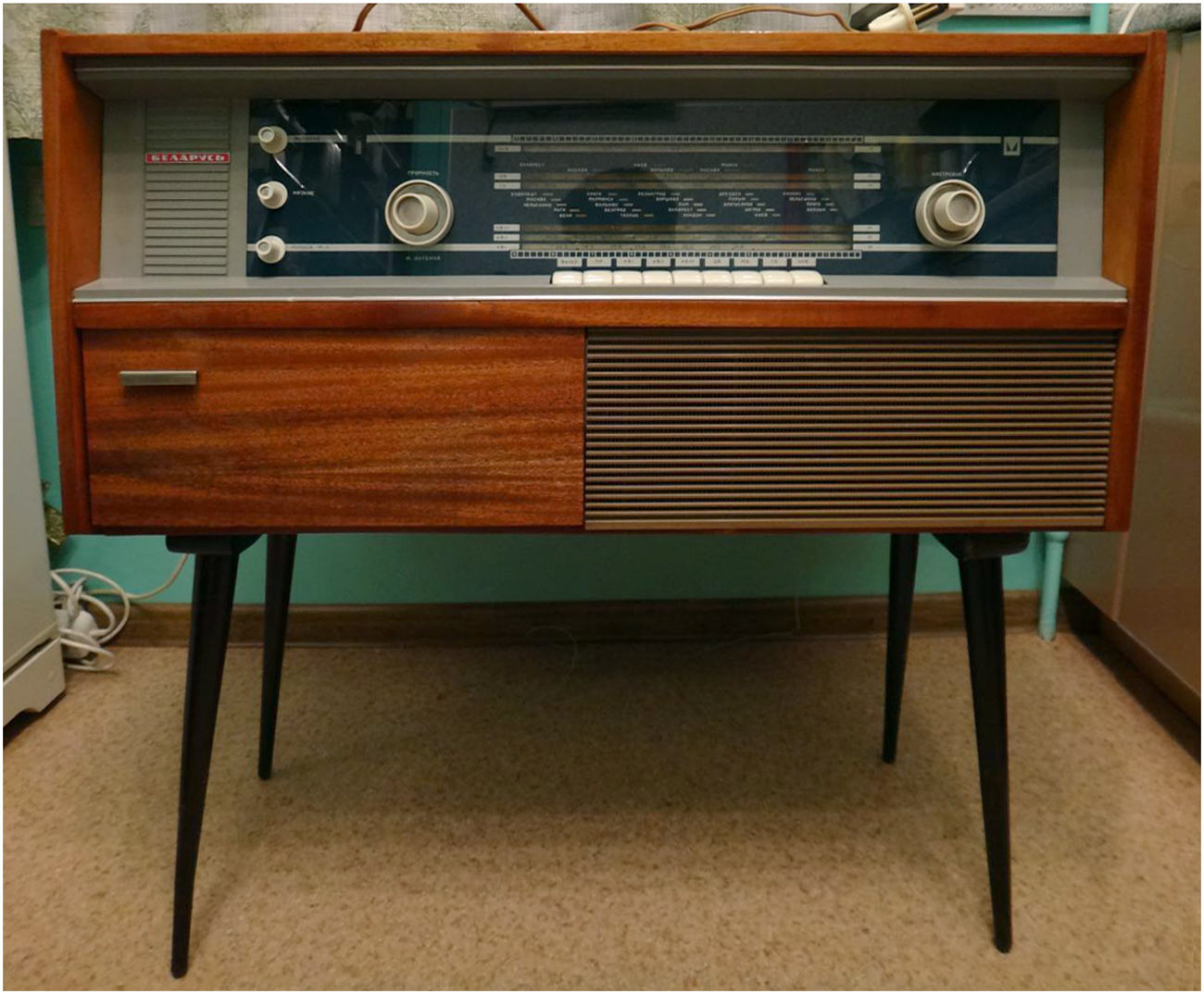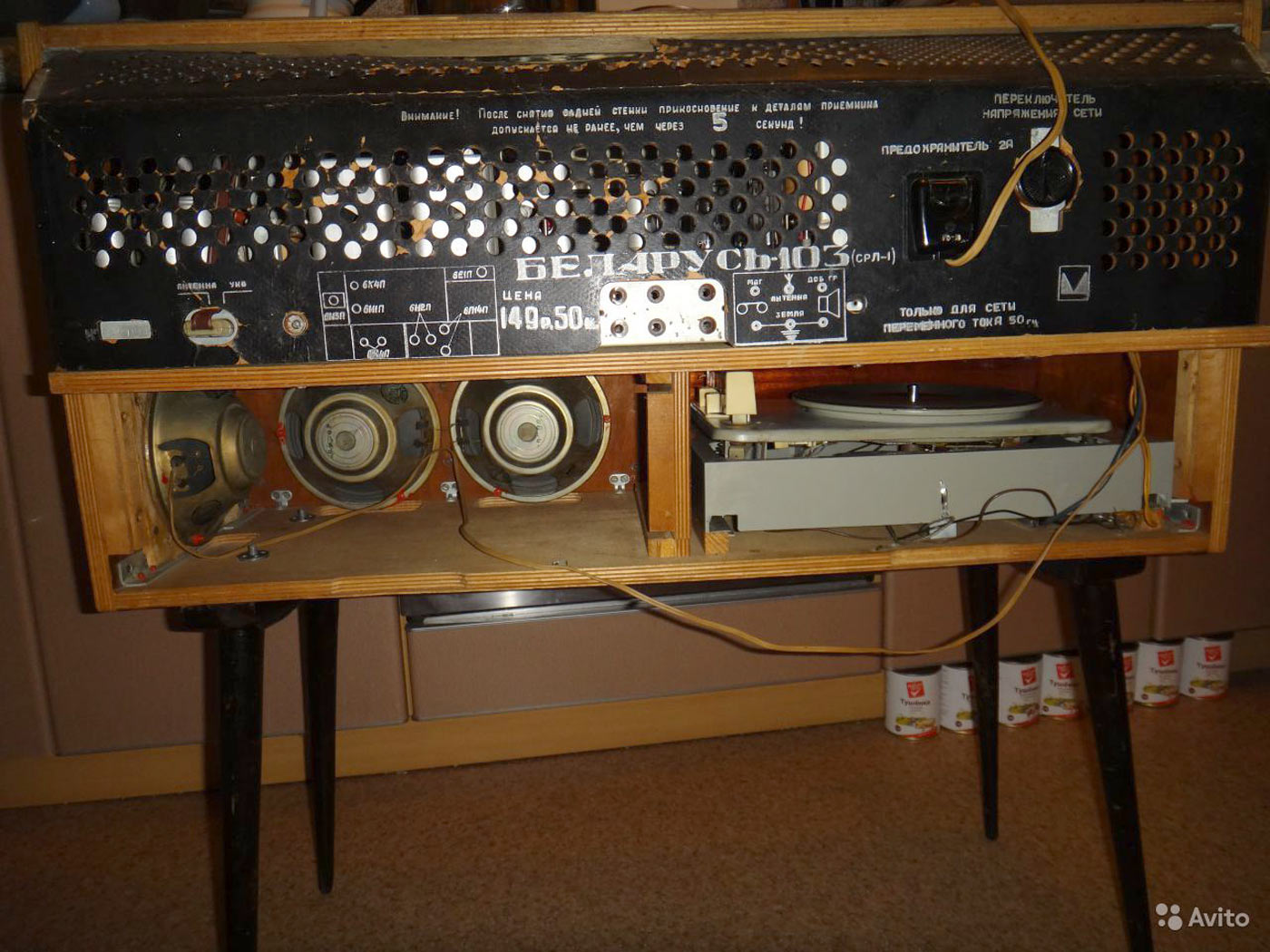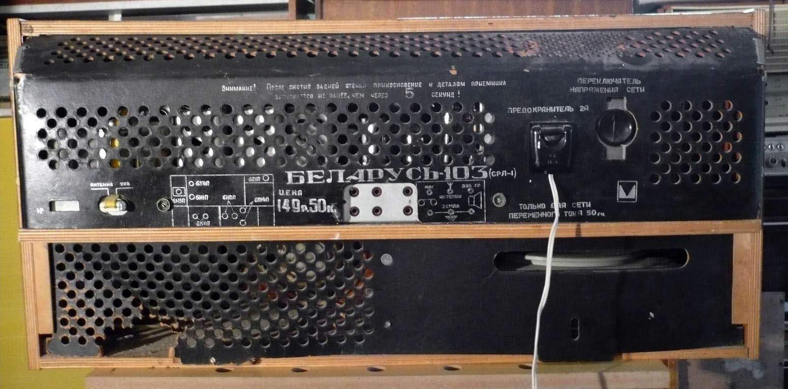 Радиола сетевая ламповая *Беларусь-103Л* с 1968 года выпускалась на Минском радиозаводе. Радиола состоит из десятилампового приёмника первого класса рассчитанного на приём радиостанций в диапазоне ДВ 150...408 кГц, СВ 525...1605 кГц, КВ3 3,95...7,6 Мгц, KB2 9,3...9,8 Мгц, KB1 11,6...12,1 Мгц и УКВ 65,8...73 Мгц и трёхскоростного II-ЭПУ-15А, с автовыключателем и микролифтом. Чувствительность с внешней антенной в ДВ, СВ, КВ диапазонах 50 мкВ, в диапазоне УКВ-ЧМ 8 мкВ. Чувствительность с магнитной антенной в ДВ,СВ диапазонах 500 мкВ/м, в положении *местный приём* 0,7 мВ. Промежуточная частота тракта AM - 465 кГц а тракта ЧМ - 6,5 Мгц. Избирательность по соседнему каналу при расстройке на 10 кГц - 60 дБ. В ЧМ усредненная крутизна скатов резонансной характеристики 0,25 дб/кгц. Ширина полосы пропускания по ПЧ в АМ тракте в положении *узкая полоса* 4 кгц, *широкая полоса* 11 кгц, *местный приём* 14 кгц, в тракте ЧМ полоса пропускания 160 кГц. Система АРУ радиолы обеспечивает изменение сигнала на выходе на 10 дБ, при изменении сигнала входа на 60 дБ. Номинальная выходная мощность усилителя - 4 Вт, максимальная - 7 Вт, диапазон воспроизводимых частот 80...12500 Гц. Пределы регулировки тембра 12 дБ. Чувствительность усилителя с гнёзд магнитофона при номинальной выходной мощности 150 мВ, уровень фона -54 дБ. Акустическая система радиолы состоит из 3 громкоговорителей 2ГД-19. Питается радиола от сети переменного тока. Потребляемая от сети мощность 100 Вт. Размеры радиолы 790х380х355 мм, её масса 27 кг.
