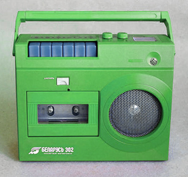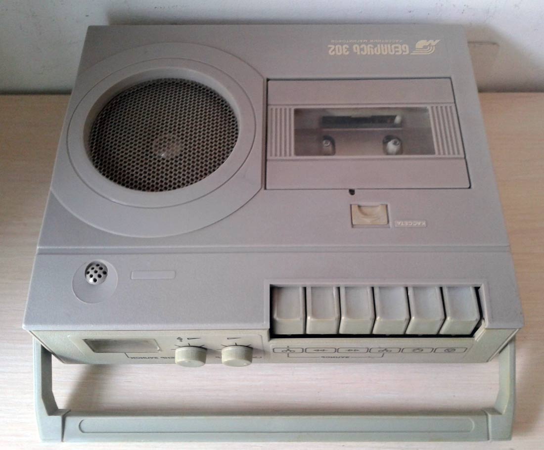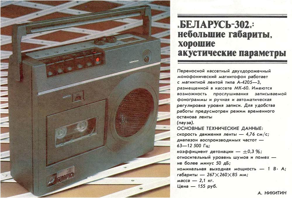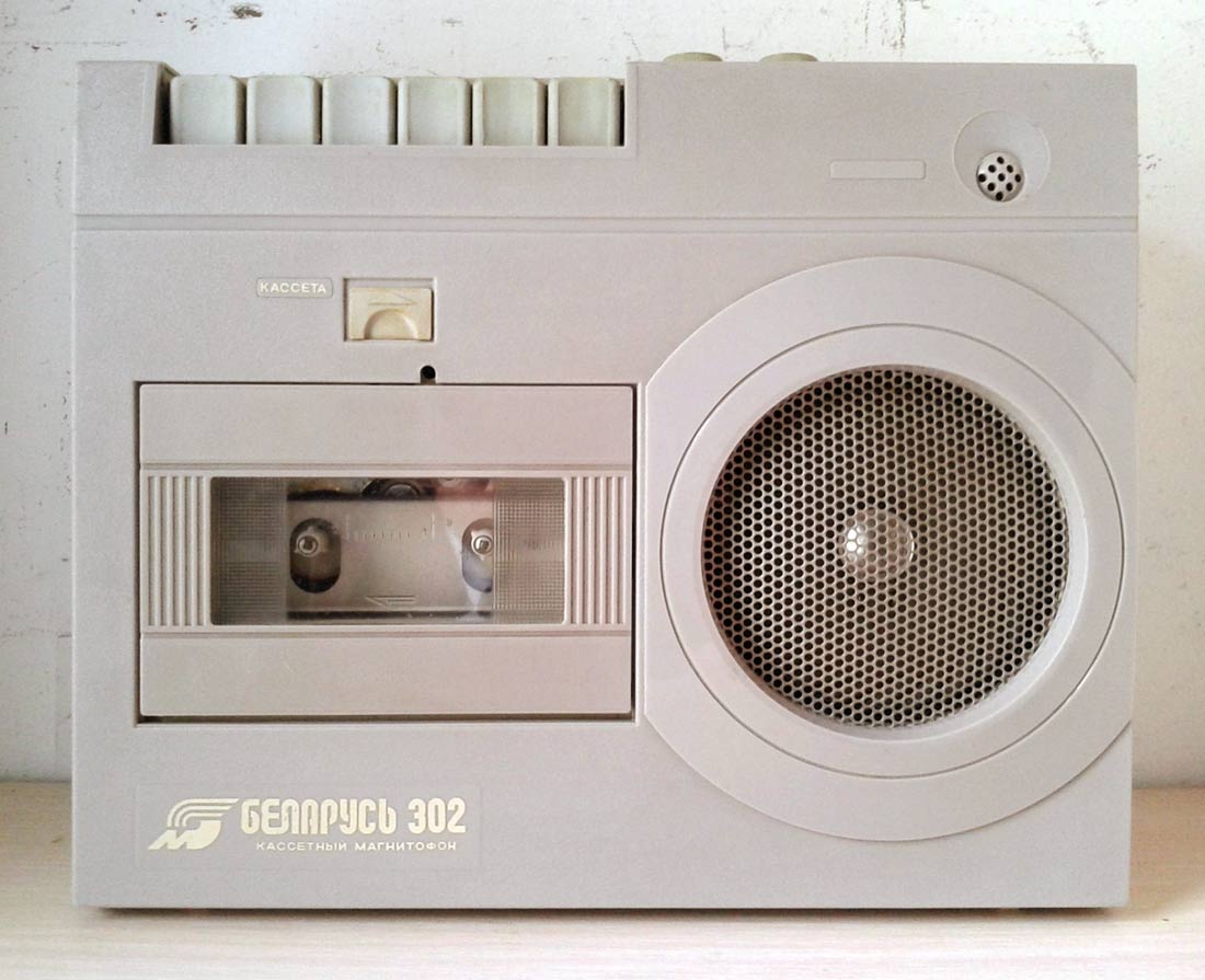 Портативный кассетный магнитофон *Беларусь-302* с начала 1988 года выпускал Могилёвский завод *Зенит*. Магнитофон 3-й группы сложности **Беларусь-302** имеет автоматическую и ручную регулировку уровня записи, стрелочный индикатор уровня записи, электретный микрофон, автостоп. Диапазон частот звука при записи и воспроизведения на ЛВ - 63...12500 Гц, воспроизводимых громкоговорителем - 120...10000 Гц. Номинальная выходная мощность 1 Вт. Питание от сети или от 6 элементов А-343. Габариты МГ - 260х267х85 мм. Масса 2,1 кг. В некоторых выпусках магнитофонов клавиши управления нажимались в двух плоскостях.