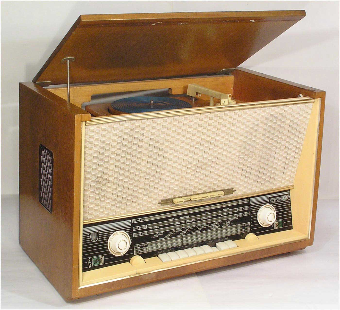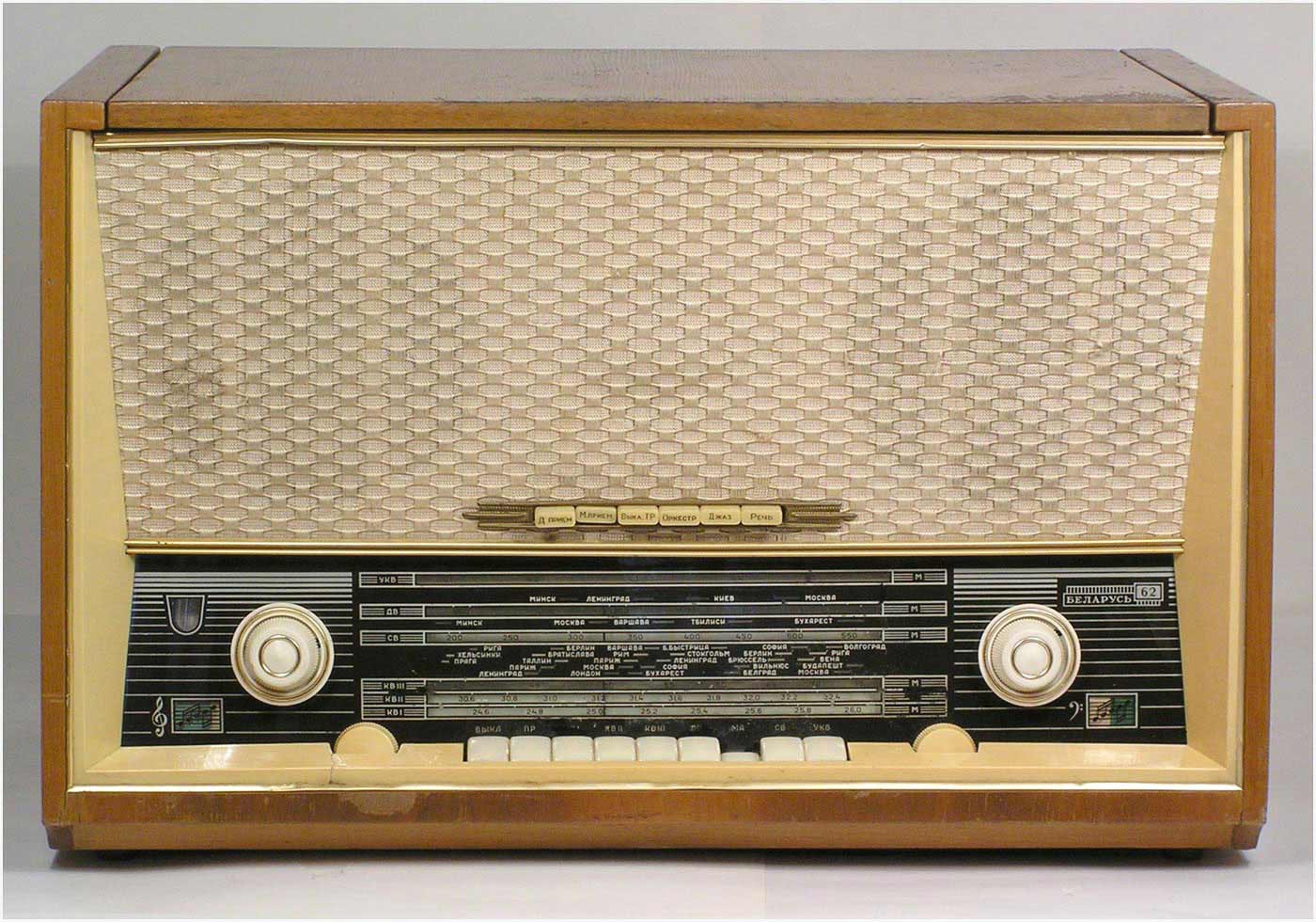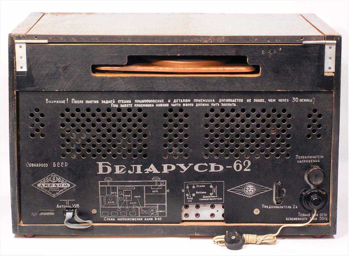 Радиола сетевая ламповая *Беларусь-62* с I-кв 1962 года выпускалась Минским радиозаводом. Радиола **Беларусь-62** состоит из одинадцатилампового приёмника 1-го класса и универсального электропроигрывающего устройства ЭПУ-4. В акустической системе радиолы установлено 5 громкоговорителей 4ГД-7 (2), 1ГД-18 (2) и 3ГД-15 (1). В диапазонах ДВ, СВ применены магнитные антенны, в диапазоне УКВ внутренний диполь. Усилитель НЧ двухтактный с регуляторами тембра, тремя тонрегистрами и тонкомпенсацией. ПЧ усилитель комбинированный, в АМ 465 кГц, ЧМ 8,4 МГц. Диапазоны ДВ 150...408 кГц, СВ 520...1605 кГц, КВ-1 11,6...12,1 мГц, КВ-2 9,3...9,8 мГц, КВ-3 4...7,6 мГц, УКВ-ЧМ 64,5...73 мГц. Чувствительность на ДВ, СВ, КВ 100 мкВ, УКВ 10 мкВ. Селективность в ДВ, СВ 60 дБ. Номинальная выходная мощность 4, максимальная 7 Вт. Полоса воспроизводимых частот в АМ тракте 80...4000 Гц, ЧМ тракте и при проигрывании пластинок 80...12000 Гц. Потребляемая мощность 75/90 Вт. Габариты модели 650х400х350 мм. Вес 24 кг.