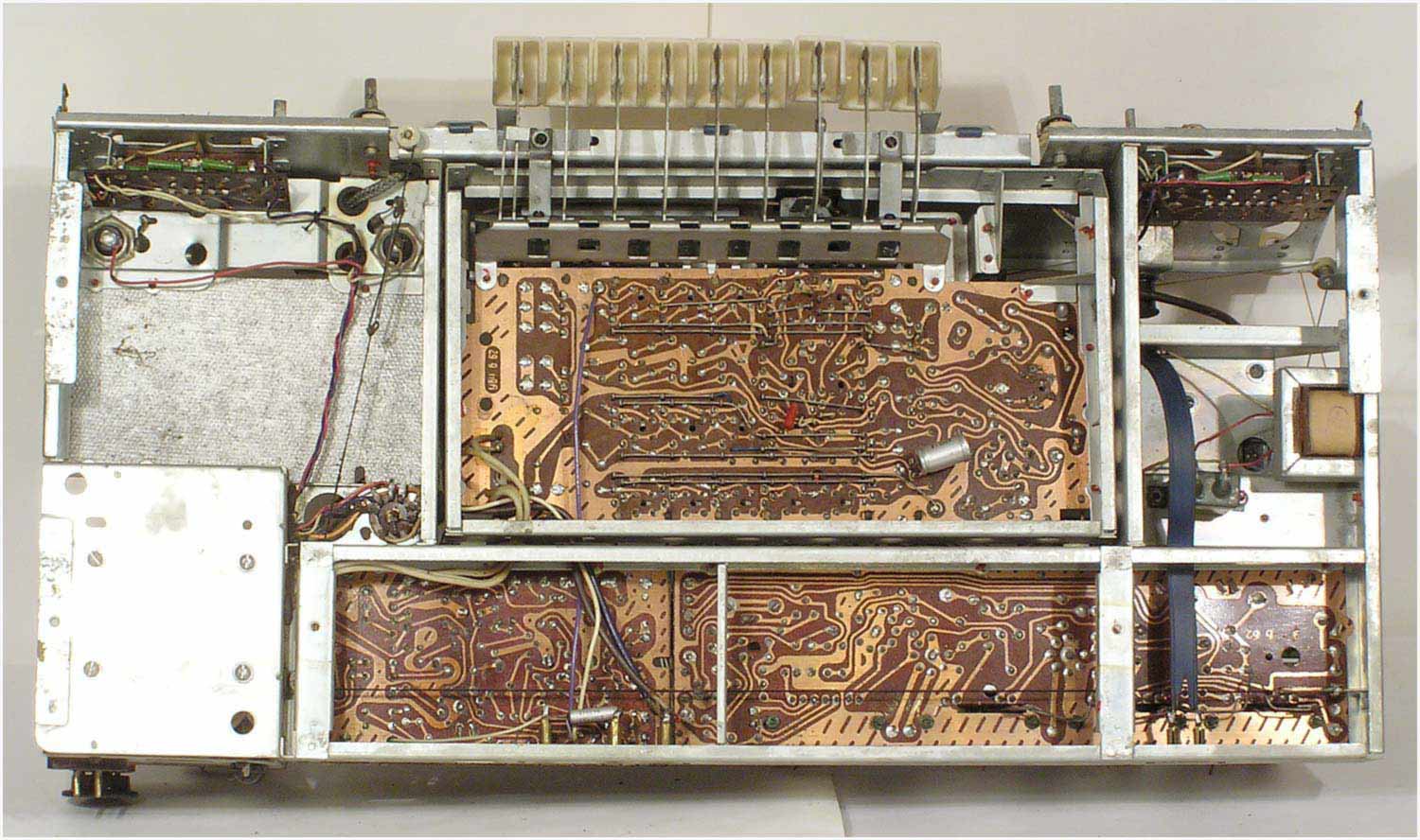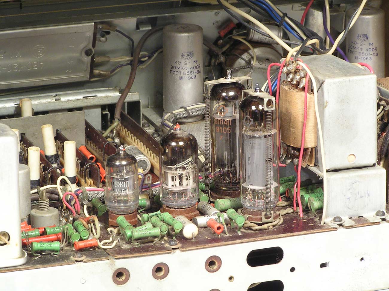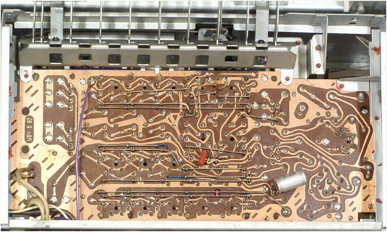 Радиола сетевая ламповая *Беларусь-62* с I-кв 1962 года выпускалась Минским радиозаводом. Радиола **Беларусь-62** состоит из одинадцатилампового приёмника 1-го класса и универсального электропроигрывающего устройства ЭПУ-4. В акустической системе радиолы установлено 5 громкоговорителей 4ГД-7 (2), 1ГД-18 (2) и 3ГД-15 (1). В диапазонах ДВ, СВ применены магнитные антенны, в диапазоне УКВ внутренний диполь. Усилитель НЧ двухтактный с регуляторами тембра, тремя тонрегистрами и тонкомпенсацией. ПЧ усилитель комбинированный, в АМ 465 кГц, ЧМ 8,4 МГц. Диапазоны ДВ 150...408 кГц, СВ 520...1605 кГц, КВ-1 11,6...12,1 мГц, КВ-2 9,3...9,8 мГц, КВ-3 4...7,6 мГц, УКВ-ЧМ 64,5...73 мГц. Чувствительность на ДВ, СВ, КВ 100 мкВ, УКВ 10 мкВ. Селективность в ДВ, СВ 60 дБ. Номинальная выходная мощность 4, максимальная 7 Вт. Полоса воспроизводимых частот в АМ тракте 80...4000 Гц, ЧМ тракте и при проигрывании пластинок 80...12000 Гц. Потребляемая мощность 75/90 Вт. Габариты модели 650х400х350 мм. Вес 24 кг.