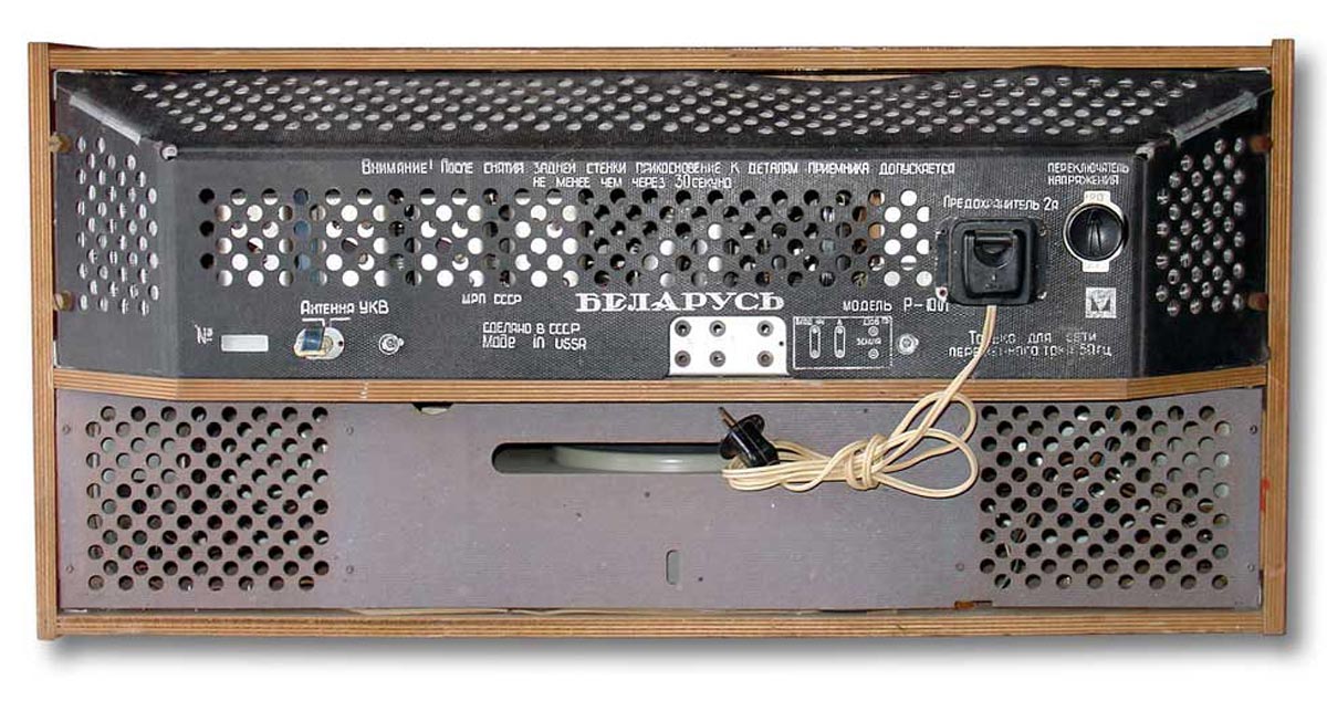 Радиола сетевая ламповая *Беларусь Р-101-Л* с 1966 года выпускалась Минским радиозаводом. Напольная ламповая радиола представляет собой 11-ти ламповый супергетеродинный радиоприёмник 1 класса с питанием от электрической сети, совмещенный с универсальным электропроигрывателем. АС радиолы состоит из четырёх громкоговорителей типа 2ГД-19. Имеется регулировка полосы пропускания по ПЧ и раздельная регулировка тембра по ВЧ и НЧ. В радиоле применены радиолампы: 6НЗП, 6К4П (3), 6И1П, 6Н2П (3), 6П14П (2), 6Е1П. Диапазоны: ДВ, СВ, УКВ стандартные. КВ-3 75,9...39,5 м, KB-2 32,3...30,6 м, KB-1 25,85...24,8 м. Чувствительность на диапазонах ДВ, СВ, KB 100 мкВ, УКВ 10 мкВ. Чувствительность с гнёзд звукоснимателя 0,25 В. Избирательность по соседнему каналу в диапазонах ДВ, СВ 60 дБ, УКВ 34 дБ. Максимальная выходная мощность 6 Вт. Потребляемая мощность 100 Вт. Полоса воспроизводимых звуковых частот в УКВ диапазоне 80...12000 Гц. Габариты радиолы - 810 х 380 х 270 мм. Масса 28 кг.