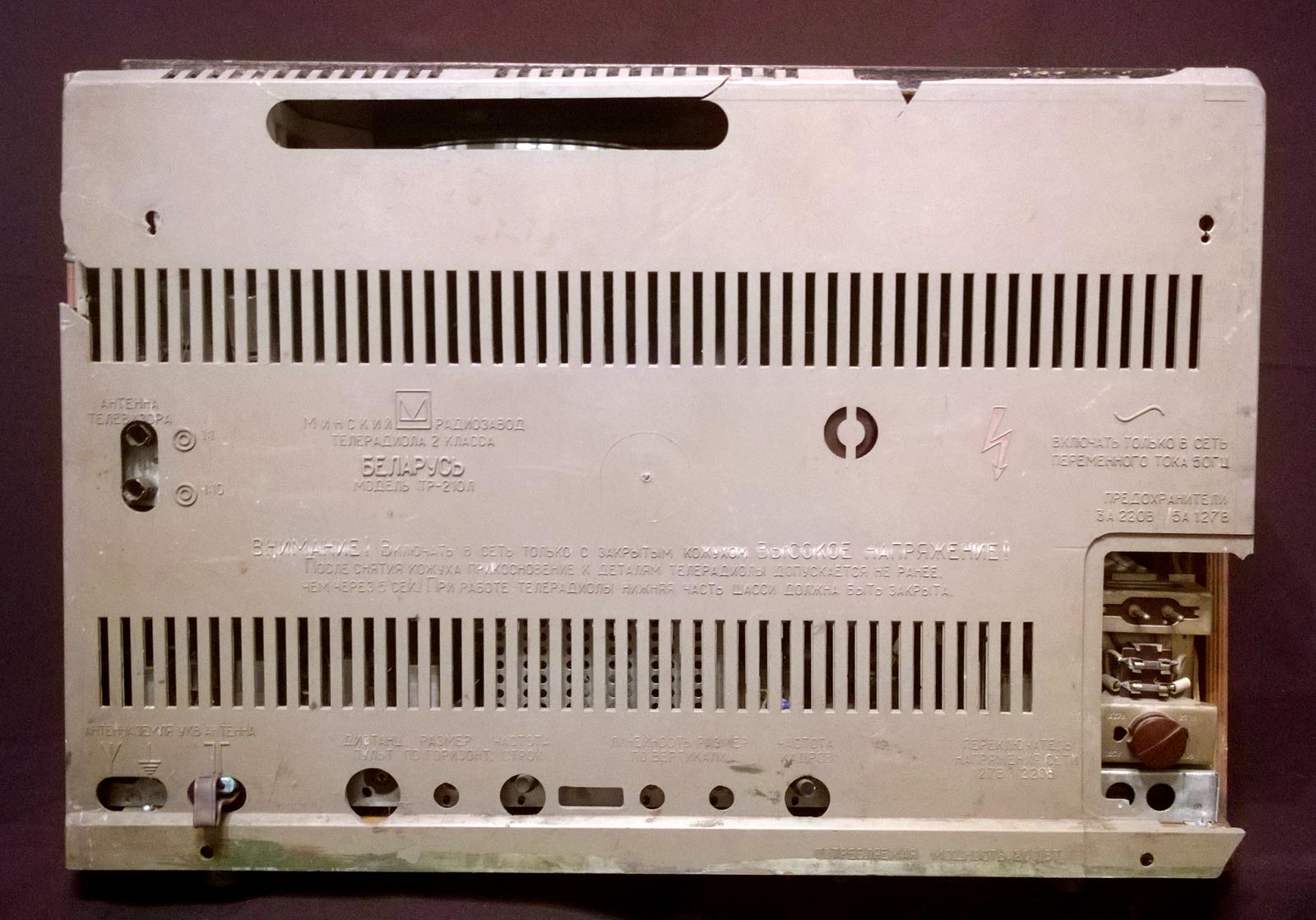 Телерадиола *Беларусь ТР-210Л* с 1966 года выпускалась Минским радиозаводом. Производилась на базе телерадиолы **Беларусь-110**, но в новом оформлении. Предназначена для приёма телепередач на любом из 12 каналов, радиостанций в диапазонах ДВ, СВ, КВ, УКВ и воспроизведения грамзаписи. Аппарат содержит 20 радиоламп и 15 диодов. В телевизоре используется кинескоп 43ЛК9Б с размером изображения 360х270 мм. Размер изображения стабилизирован схемами и не меняется при изменении напряжения в сети на 10%. Чувствительность телерадиолы на каналах изображения или звукового сопровождения 100 мкВ. ПЧ канала изображения 38,0 Мгц. Первая ПЧ канала звукового сопровождения 31,5, вторая 6,5 Мгц. Разрешающая способность 450 линий. Проводной пульт ДУ позволяет регулировать яркость и громкость на расстоянии до 4 метров. Приёмник имеет диапазоны: ДВ, СВ, КВ 5,8...12,2 Мгц, УКВ 65,8...73 Мгц. ПЧ для АМ диапазонов 465 КГц, ЧМ 6,5 Мгц. Чувствительность в АМ диапазонах 250 мкВ, ЧМ 30 мкВ. ЭПУ позволяет воспроизводить грамзапись с обычных и долгоиграющих пластинок на скорости 78, 45 и 33 об/мин. УНЧ имеет номинальную выходную мощность 1,5 Вт. Полоса воспроизводимых частот 100...10000 Гц. В футляре тлр установлено два громкоговорителя 1ГД-18 (1ГД-19). Потребляемая мощность ТВ 200, приёмника или ЭПУ 75 Вт. Телерадиолу выпускали в настольном и напольном оформлениях.