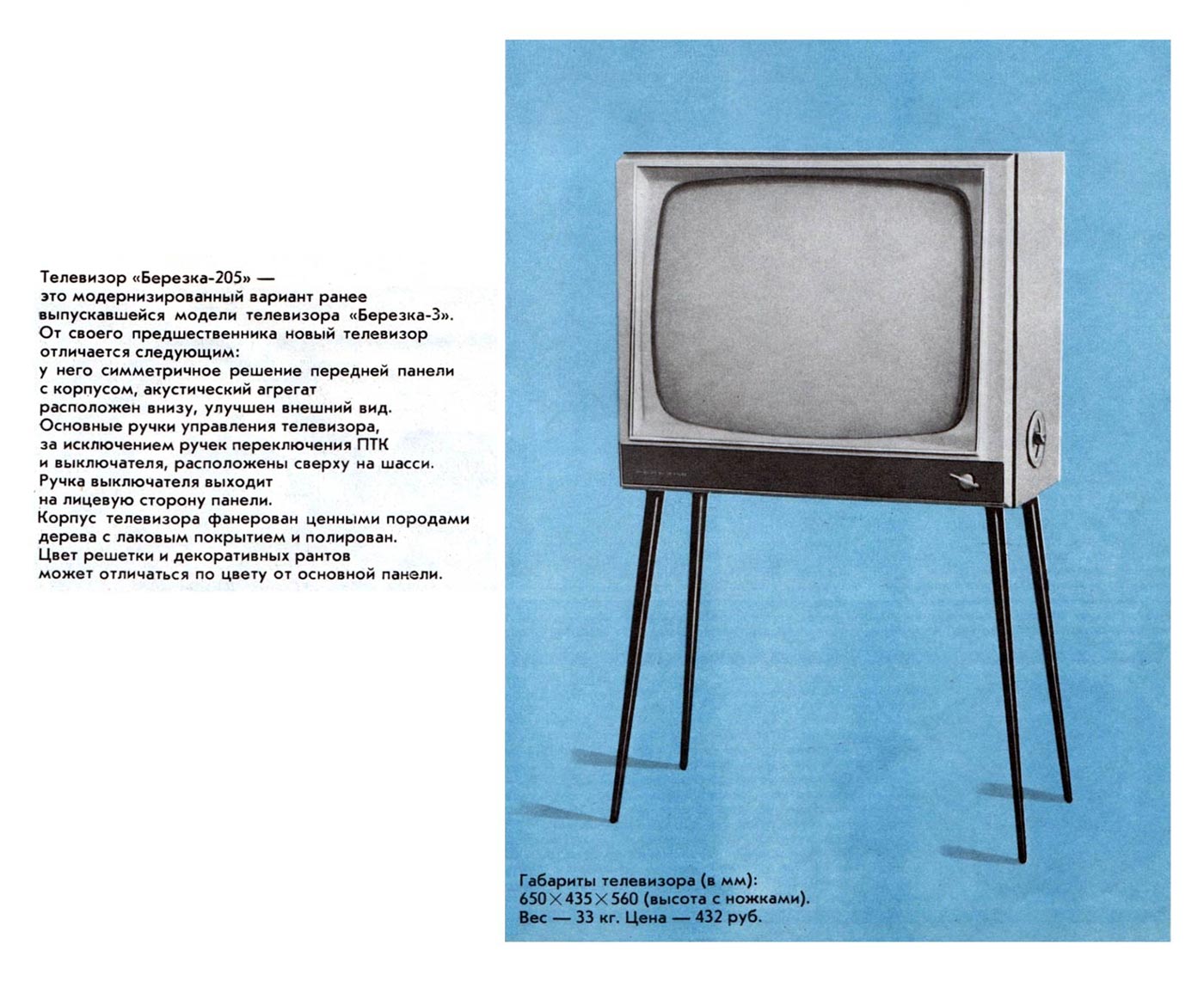 Телевизионный приёмник ч/б изображения *Берёзка-205* с 1970 года выпускал Харьковский завод Коммунар. **Берёзка-205** - унифицированный телевизионный приёмник 2-го класса для приёма телевизионных программ в ч/б изображении типа УЛТ-59-II-1 (старая унификация УНТ-59-II-1). Телевизор предназначен для приёма телевизионных программ и их звукового сопровождения на любом из 12-ти каналов метрового диапазона. Телевизор выпускался в настольном и напольном вариантах. Технические параметры модели: Размер изображения 385х489 мм. Кинескоп типа 59ЛК2Б. Количество ламп - 17, диодов - 22. Чувствительность 50 мкВ. Номинальная выходная мощность 1,5 Вт. Потребляемая мощность 180 Вт. Габариты телевизора без ножек 635х530х425 мм. Масса 26 кг. Выпуск телевизора начат 10 мая 1970 года, завершился в начале июня 1972 года.