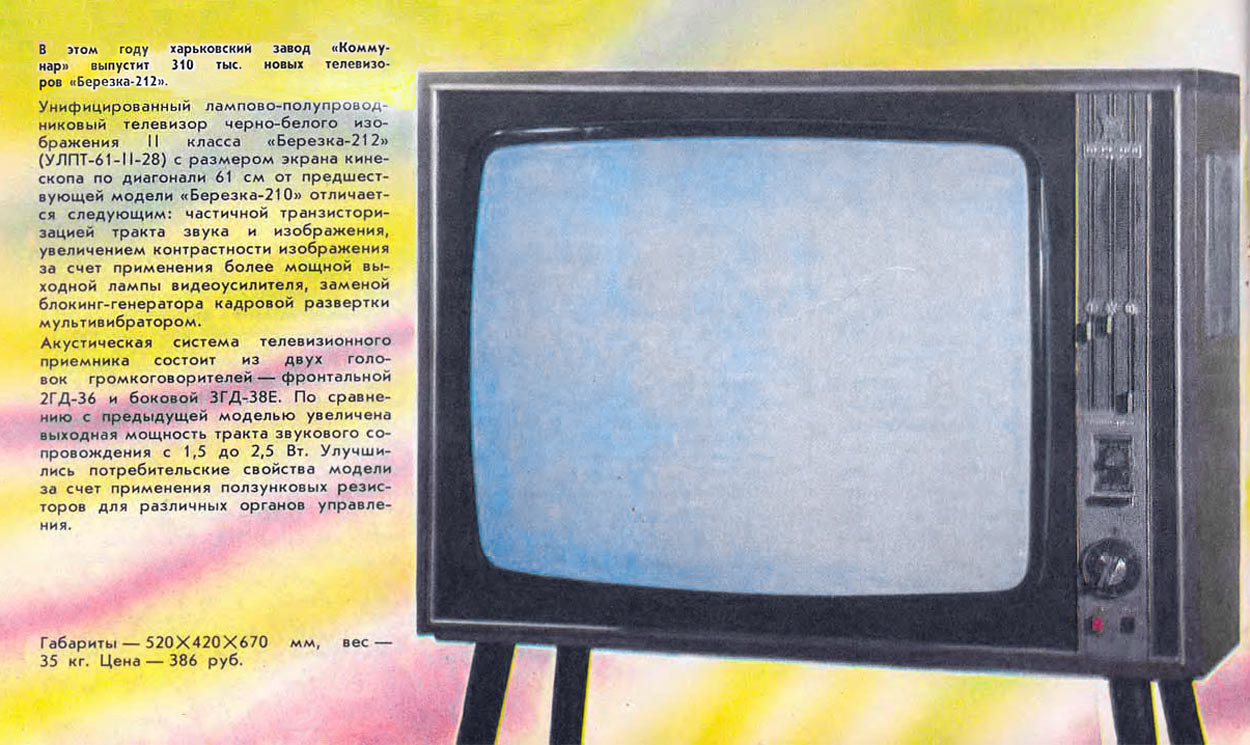 Телевизионный приёмник чёрно-белого изображения *Берёзка-212* с 1974 года выпускал Харьковский завод *Коммунар*. Унифицированный телевизор второго класса **Берёзка-212** выпускался в настольном и напольном вариантах. Корпус телевизора отделан ценными породами дерева и пластмассой. Сзади аппарат закрыт стенкой из пластмассы. На передней панели находятся основные ручки управления ползункового типа: ручки контрастности, яркости и громкости, ручка настройки гетеродина ДМВ, переключатель МВ/ДМВ, переключатель МВ каналов, кнопки включения и выключения. Телевизор работает в любом из 12-ти каналов диапазона МВ. В нём имеется возможность приёма и в ДМВ диапазоне после установке блока СКД-1. В модели имеется АПЧ и Ф, ключевая АРУ. Акустическая система с двумя громкоговорителями 3ГД-38Е и 2ГД-36, регуляторы тембра по ВЧ и по НЧ. Имеются гнёзда для записи звука на магнитофон и прослушивание его на головные телефоны, при отключенных динамиках. Возможно управление громкостью и яркостью на расстоянии с помощью проводного ПДУ. Чувствительность телевизора 50 мкВ. Разрешающая способность аппарата по вертикали 500 линий, по горизонтали 450 линий. Максимальная выходная мощность канала звукового сопровождения - 2,5 Вт. Диапазон воспроизводимых частот - 100...10000 Гц. Потребляемая от электрической сети мощность - 180 Вт. Габариты телевизора - 685 х 525 х 420 мм. Масса 36 кг. Розничная цена модели 296 руб.