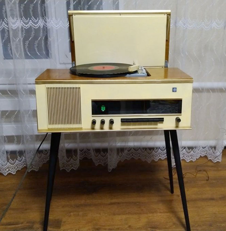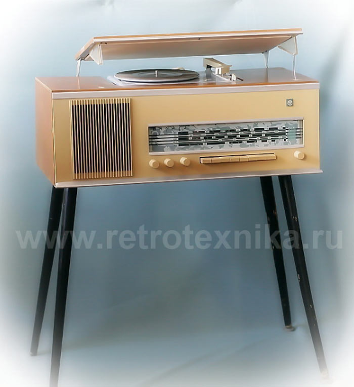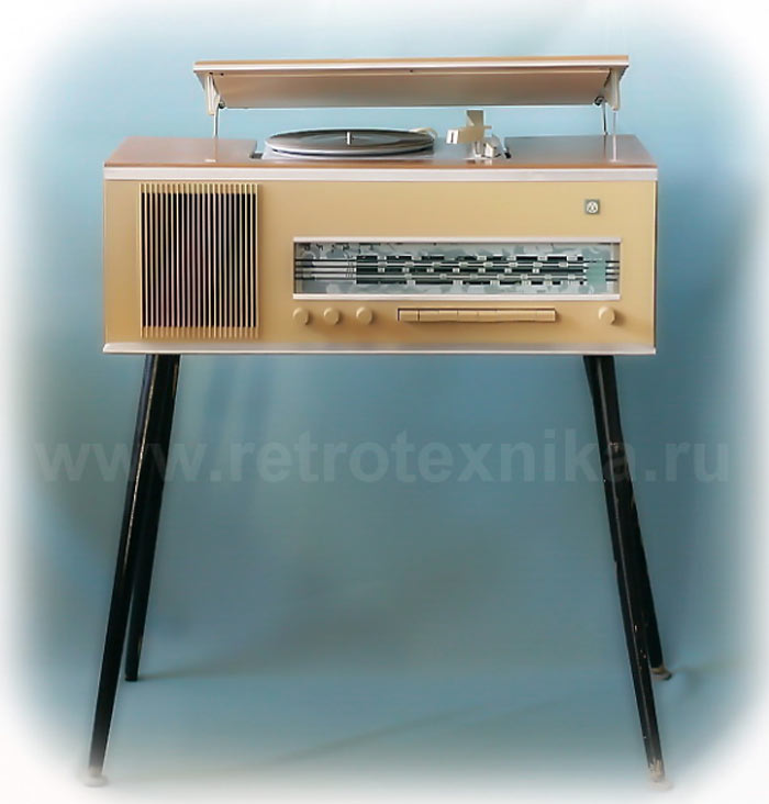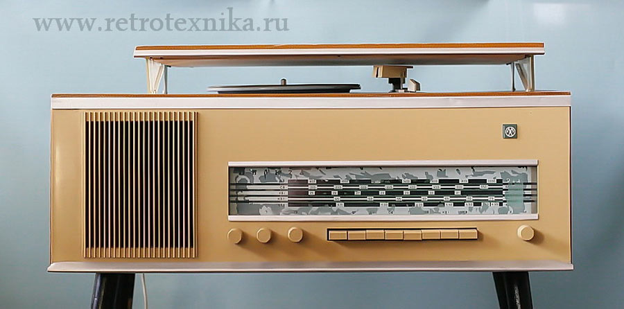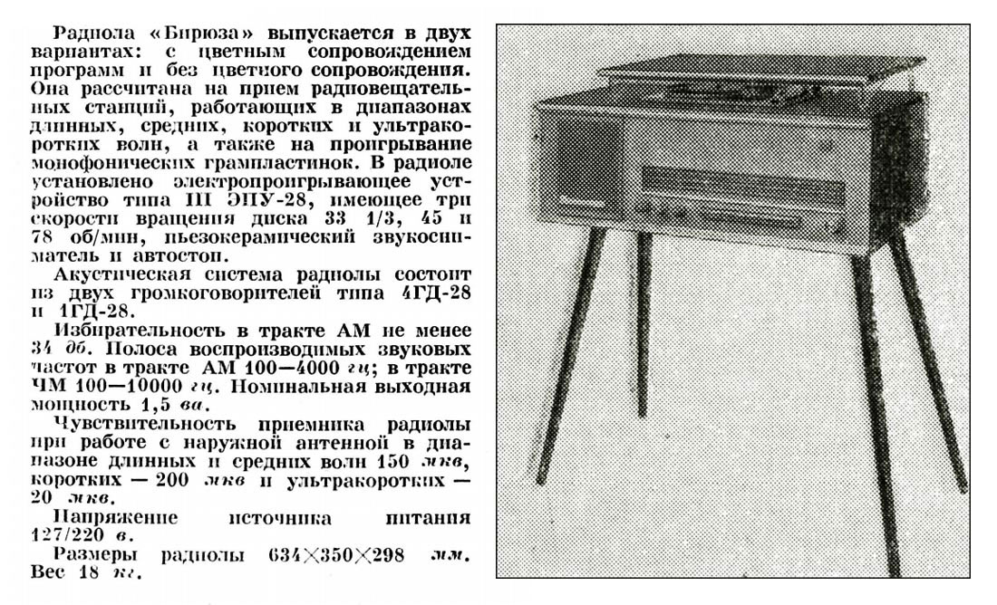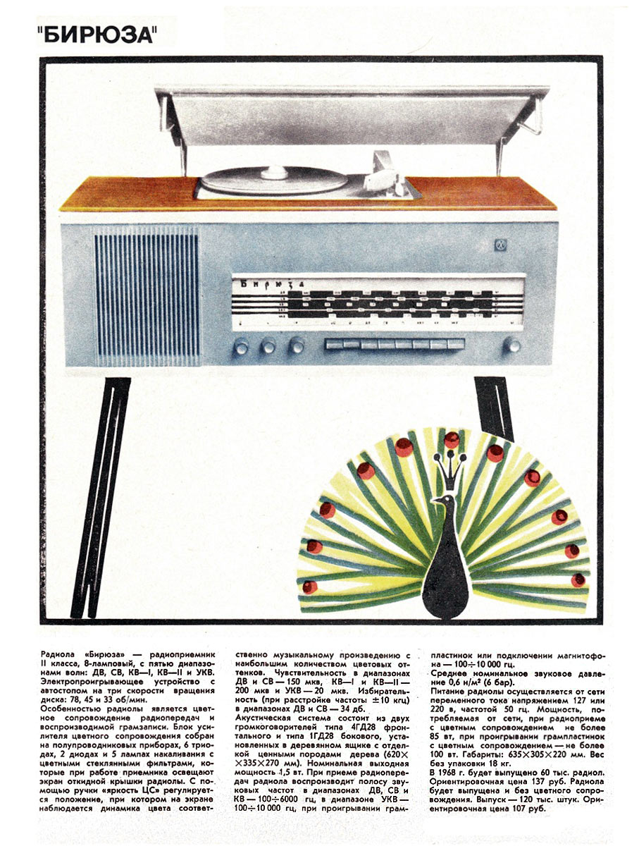 Радиолу *Бирюза* с 1968 года выпускал Муромский завод РИП. Радиола *Бирюза* выпускалась в 2-х вариантах: с цветовым сопровождением радио и музыкальных программ и без него. Радиола рассчитана на приём радиостанций в диапазонах ДВ, СВ, КВ, УКВ и для проигрывания грампластинок. В радиоле установлено ЭПУ типа III-ЭПУ-28, имеющее три скорости вращения диска; 33, 45, 78 об/мин, пьезокерамический звукосниматель и автостоп. АС радиолы состоит из двух громкоговорителей типа 4ГД-28 и 1ГД-28. Избирательность в тракте АМ около 34 дБ. Полоса воспроизводимых звуковых частот тракта АМ - 100...4000 Гц, УКВ ЧМ и грамзаписи - 100...10000 Гц. Номинальная выходная мощность УНЧ 1,5 Вт. Чувствительность в АМ тракте - 150 мкВ, ЧМ - 20 мкВ. Питается радиола от электрической сети 127 или 220 В. Габариты радиолы 634х350х298 мм. Масса 18 кг. По своей конструкции и электрической схеме радиола схожа с радиолой **Гамма-В**, но не имеет экрана для ЦМУ.