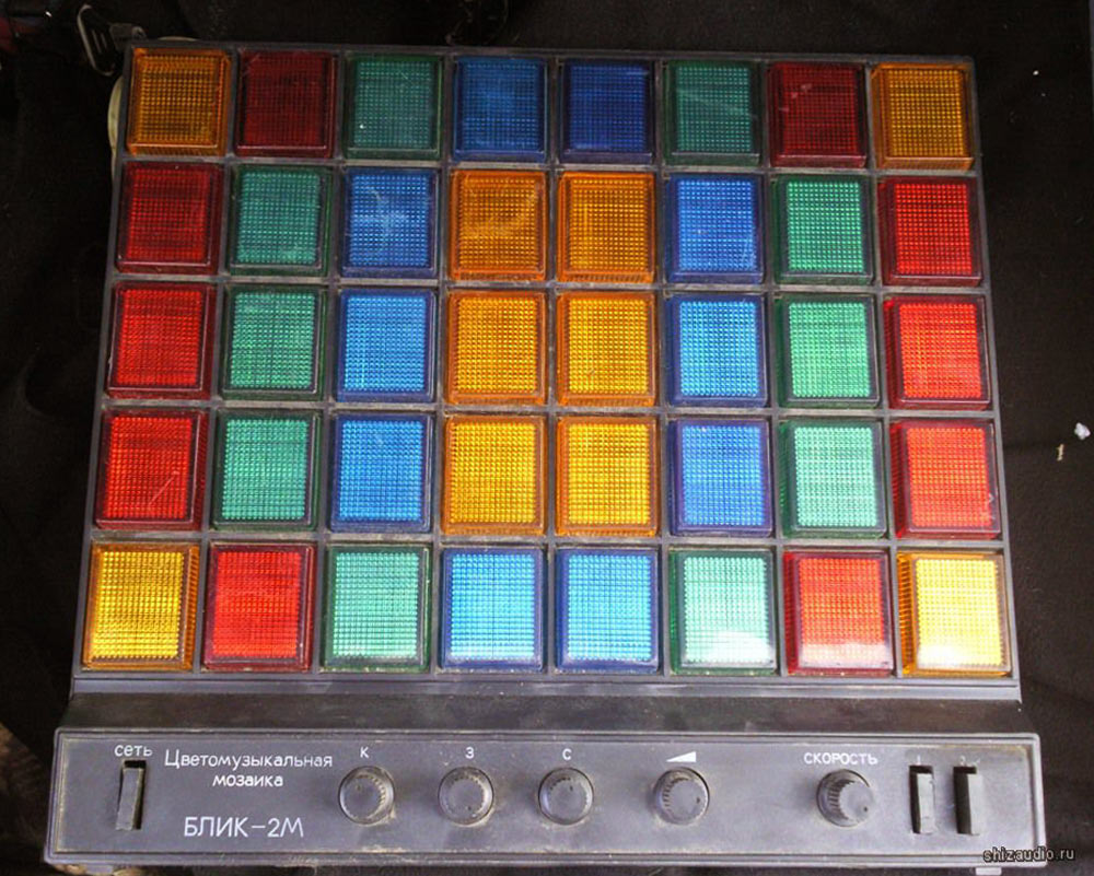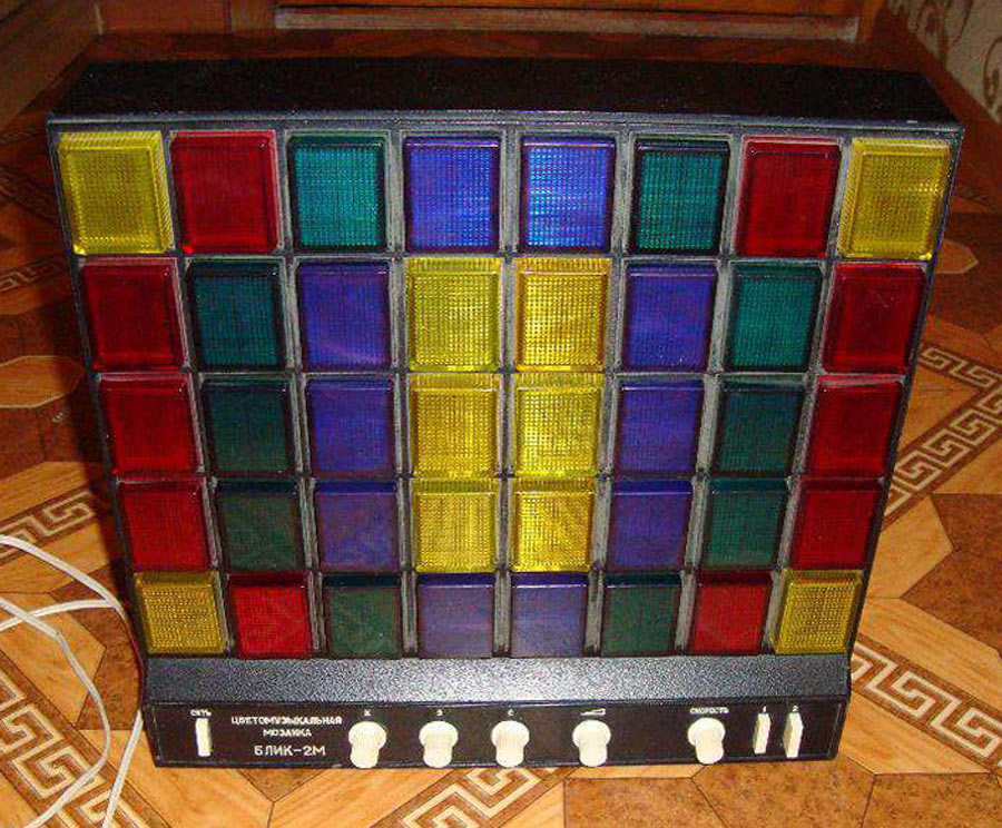 Цветомузыкальная мозаика *Блик-2М* выпускалась с 1991 года Одесским заводом *Нептун*. ЦМ предназначена для декоративного освещения жилых помещений и создания цвето и светодинамических эффектов при прослушивании речевых и музыкальных фонограмм. Количество основных каналов 3. Количество каналов подсветки 1. Потребляемая мощность 140 Вт. Габариты ЦМ -341х321х90 мм. Масса 4 кг.