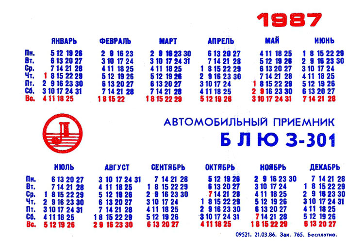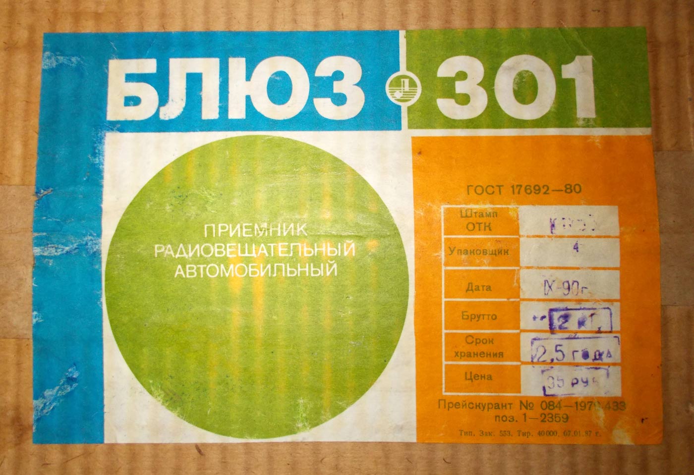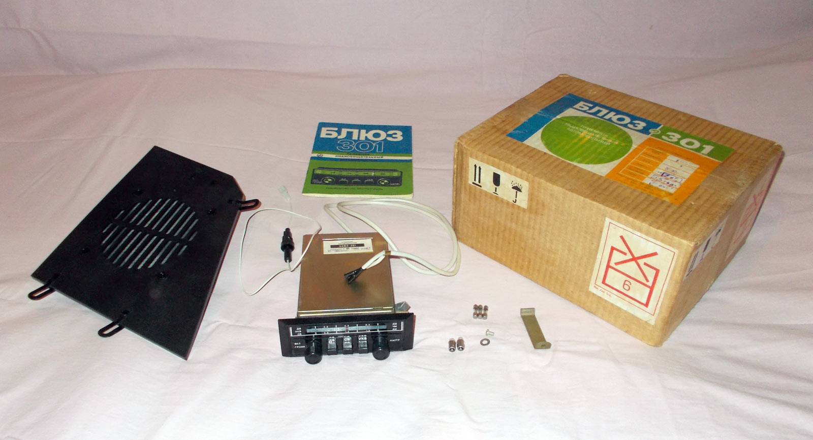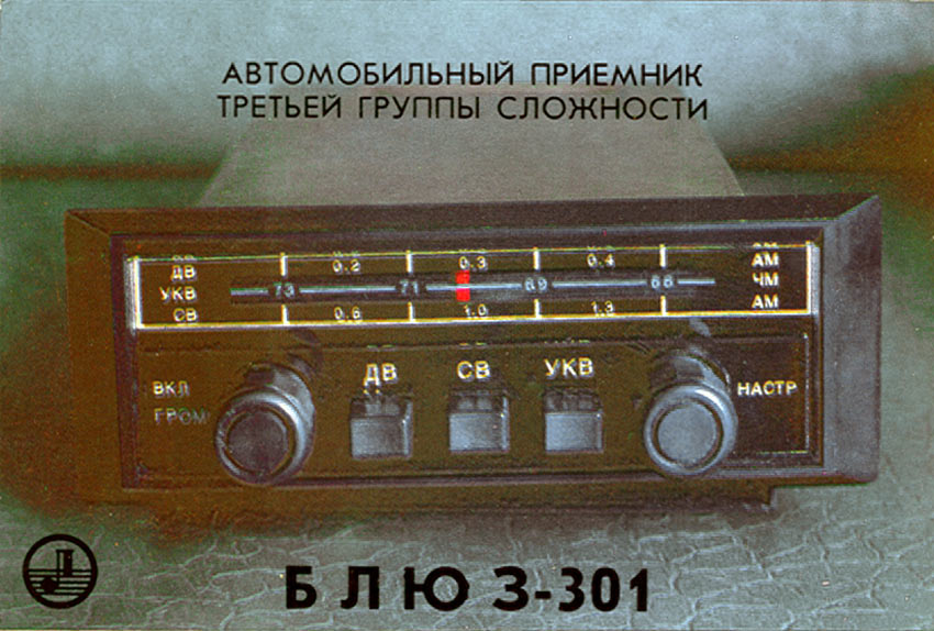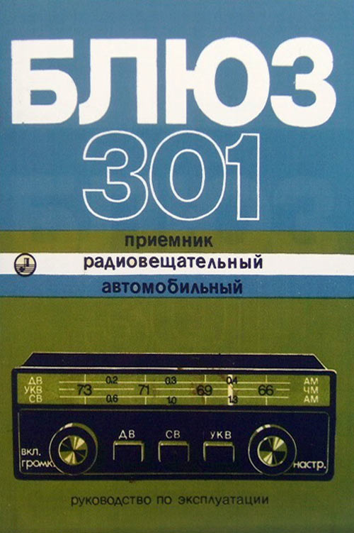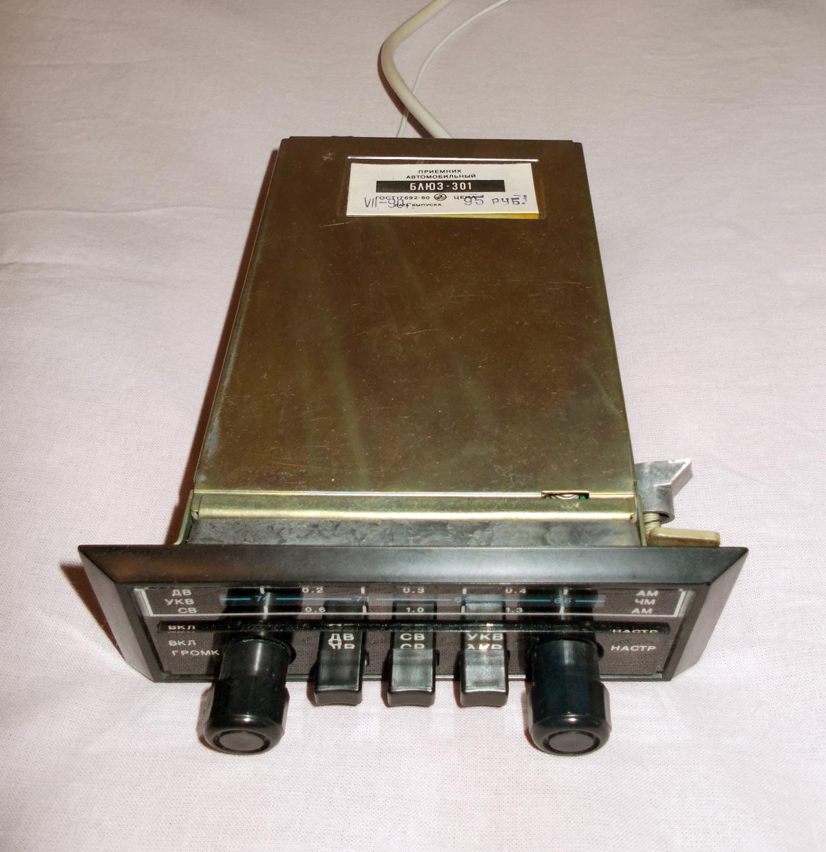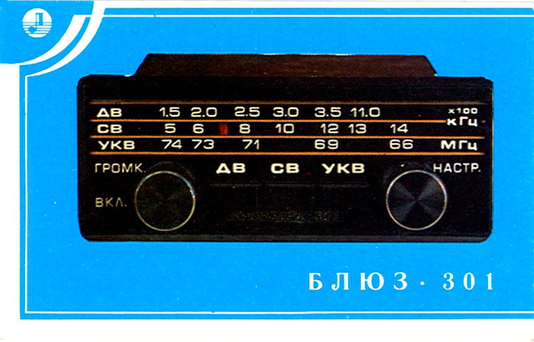 Радиоприёмник автомобильный *Блюз-301* с 1985 года выпускало Ленинградское ПО *Ленинец*. Приёмник предназначен для установки в салонах легковых автомобилей «ВАЗ». Он обеспечивает приём в диапазонах ДВ, СВ и УКВ-ЧМ, имеет плавную настройку на радиостанцию, плавную регулировку громкости, кнопочный переключатель диапазонов. Лицевая часть модели изготовлена из ударопрочного полистирола, а корпус из специальной листовой жести. Чувствительность в диапазонах: ДВ - 220 мкВ, СВ - 60 мкВ, УКВ - 5 мкВ. Диапазон воспроизводимых частот тракта АМ - 100...4000 Гц, тракта ЧМ - 100...10000 Гц. Номинальная выходная мощность 1, максимальная 2,5 Вт. Напряжение питания от 10,8...15,6 В. Габариты РП без ручек и угольников крепления 39х96х157 мм. Вес с громкоговорителем, без упаковки 1,6 кг. Цена 95 рублей.