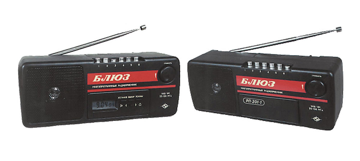 Стационарный транзисторный радиоприёмник *Блюз РП-201* с 1996 года выпускало Омское ПО *Иртыш*. Приёмник предназначен для приёма радиовещательных станций в УКВ диапазоне, а так же звукового сопровождения телевидения с 1 по 5 канал. Приёмник имеет: предварительную настройку на шесть фиксированных частот в любом из двух диапазонов 56...74 или 83...108 МГц; телескопическую антенну; гнездо наружной антенны; индикацию часов; включение приёмника в заданное время; подачу одиночного звукового сигнала так же в заданное время; регулятор громкости будильника и возможность настольного или настенного размещения. Диапазон звуковых частот 316...6300 Гц. Чувствительность 10 мкВ. Диапазон регулировки громкости 40 дб. Питание от сети 220 В. Размеры приёмника 300х122х99 мм. Масса 1,5 кг. Радиоприёмник *Блюз РП-201-1* полностью аналогичен базовому, но не имеет таймерного устройства.