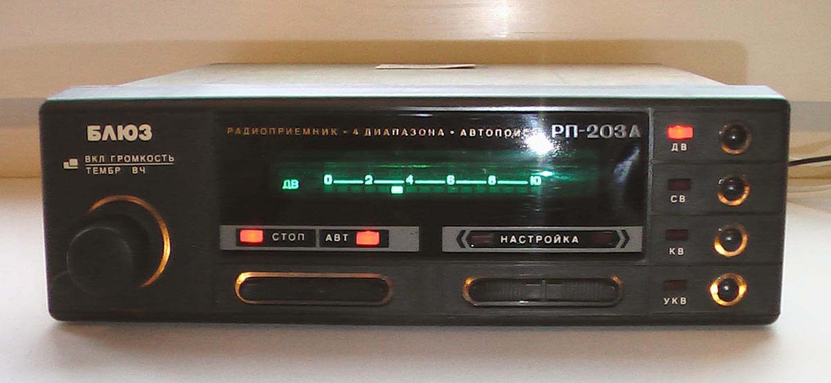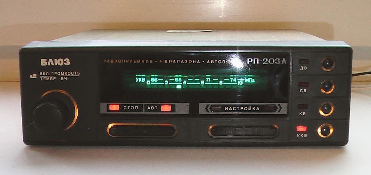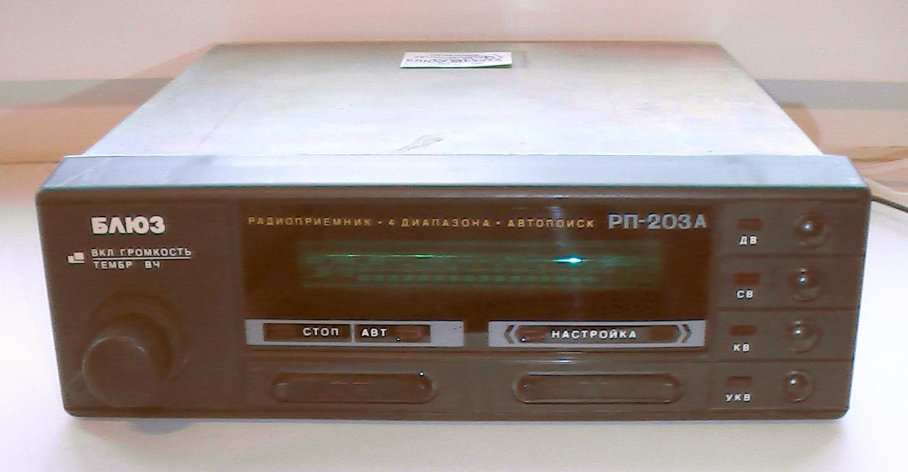 Радиоприёмник автомобильный *Блюз РП-203А* с I-кв 1990 года выпускало Ленинградское ЦНПО *Ленинец*. Радиоприёмник работает в диапазонах ДВ, СВ, КВ (30,6...31,6 м) и УКВ-ЧМ. В нём применена люминисцентная шкала настройки, автомаический поиск станций. Номинальная выходная мощность 5 Вт, максимальная 10 Вт. Диапазон рабочих частот по напряжению на выходе для громкоговорителя в диапазоне УКВ-ЧМ - 40...12500 Гц.