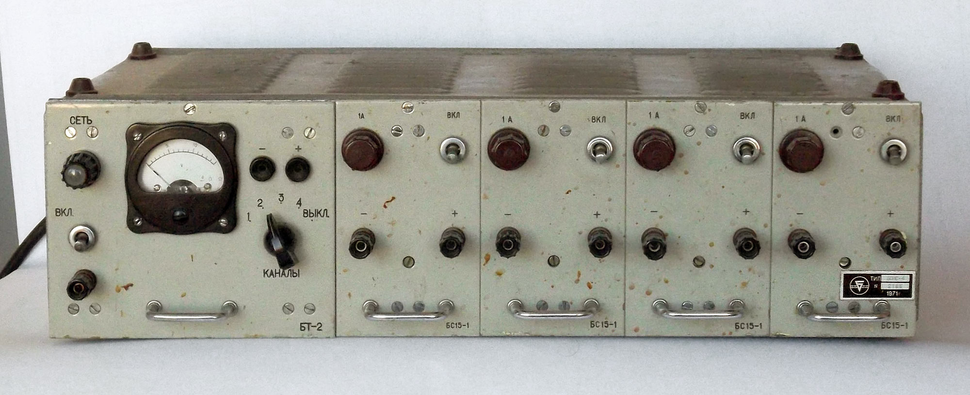 Блок питания *БПНС-4* выпускался с 1971 года. В блоке 4 независимых блока стабилизированного напряжения с регулировкой до 15 В, ток 1 А.