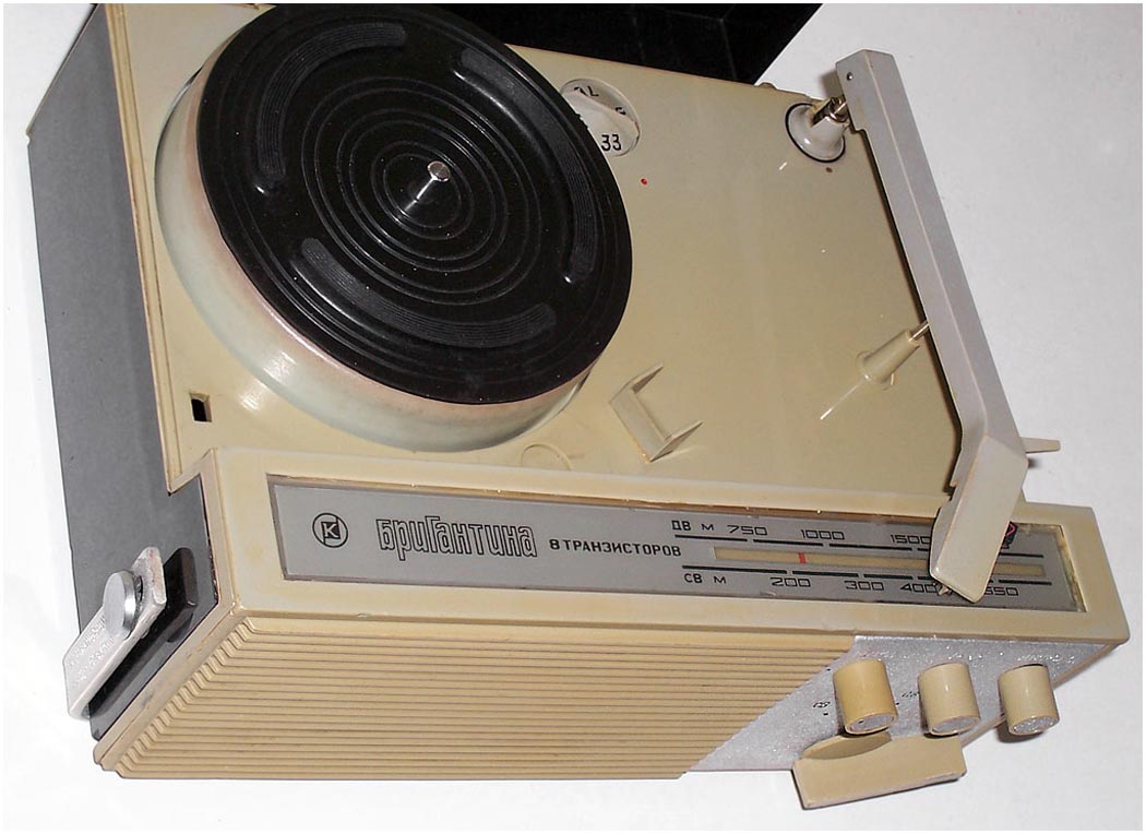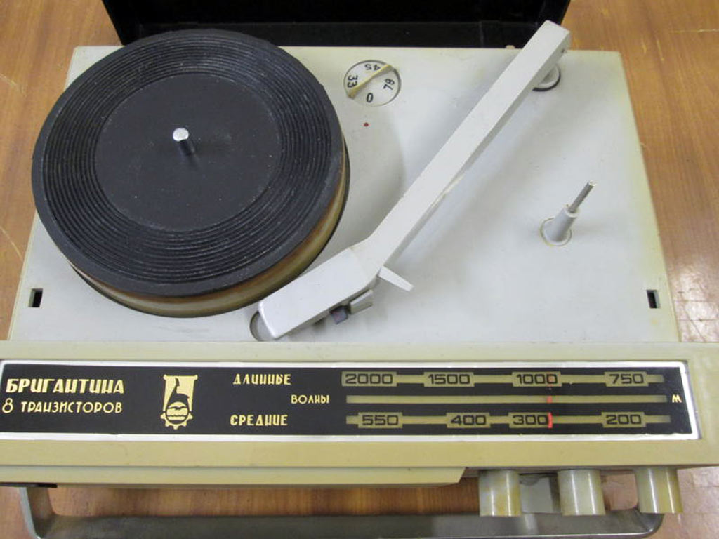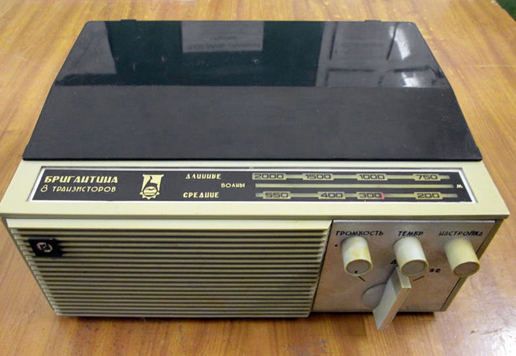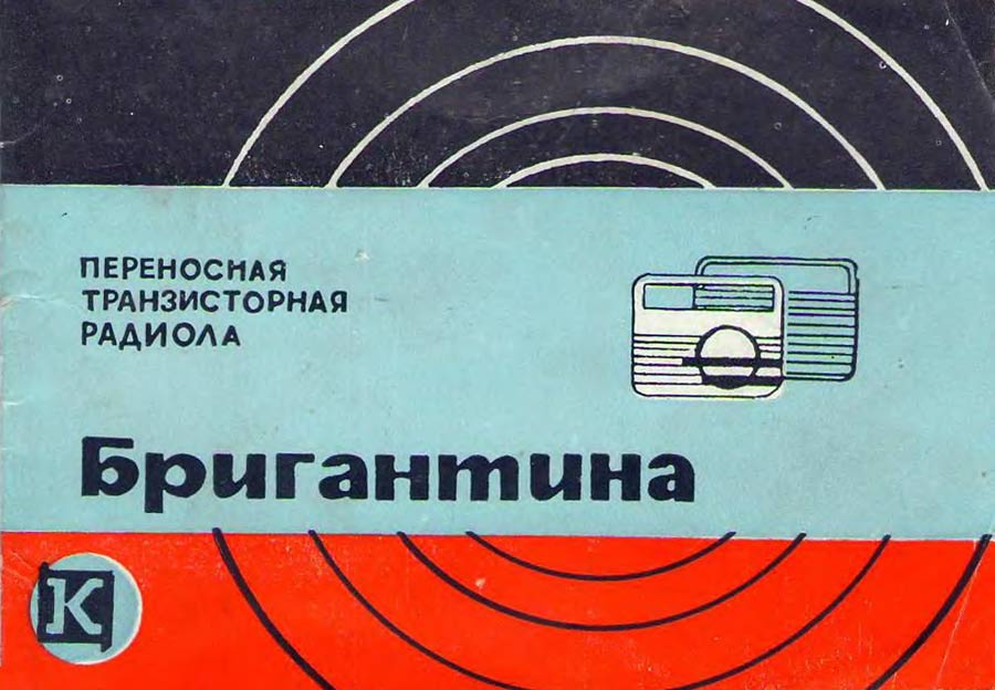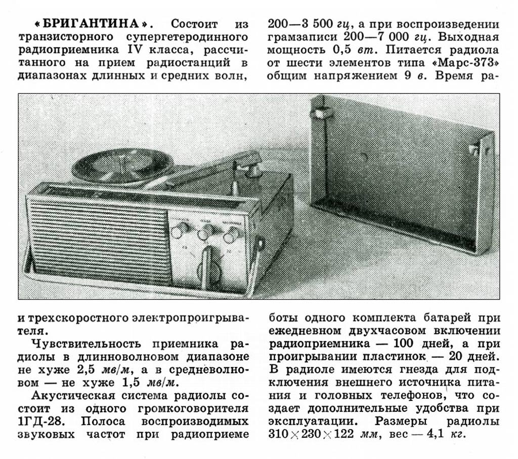Портативная радиола *Бригантина* с 1969 года выпускалась Кыштымский радиозаводом. Радиола **Бригантина** - одна из немногих портативных транзисторных радиол выпущенных отечественной радиопромышленностью. Радиола предназначена для приёма радиовещательных станций в диапазонах длинных и средних волн на внутреннюю магнитную антенну и воспроизведения грампластинок на трёхскоростном ЭПУ. Радиола работает в автономном режиме от 6-ти батарей типа 373 и в стационарном, питаясь от сетевого выпрямителя. В 1970 году электрическая схема радиолы была модернизирована и в справочнике описан именно этот вариант. Чувствительность радиоприёмника радиолы в длинноволновом диапазоне не хуже 2,5 мВ/м, в средневолновом не хуже 1,5 мВ/м. Акустическая система радиолы состоит из одного громкоговорителя 1ГД-28. Полоса воспроизводимых звуковых частот при радиоприёме - 200...3500 Гц, а при воспроизведении грамзаписи - 200...7000 Гц. Номинальная выходная мощность усилителя - 0,5 Вт. Время работы радиолы от свежего комплекта батарей при ежедневном двухчасовом радиоприёме около 100 дней, при проигрывании грампластинок около 20 дней. В радиоле имеются гнёзда для подключения источника внешнего питания и головных телефонов. Габариты радиолы 310 х 230 х 122 мм, масса с батареями питания - 4,1 кг.
