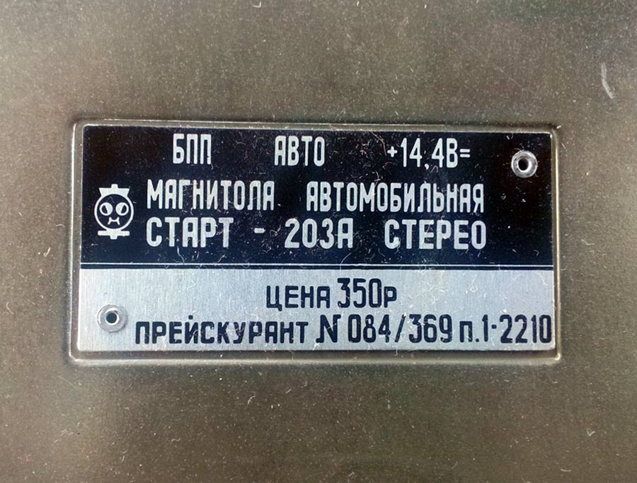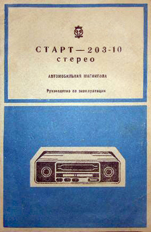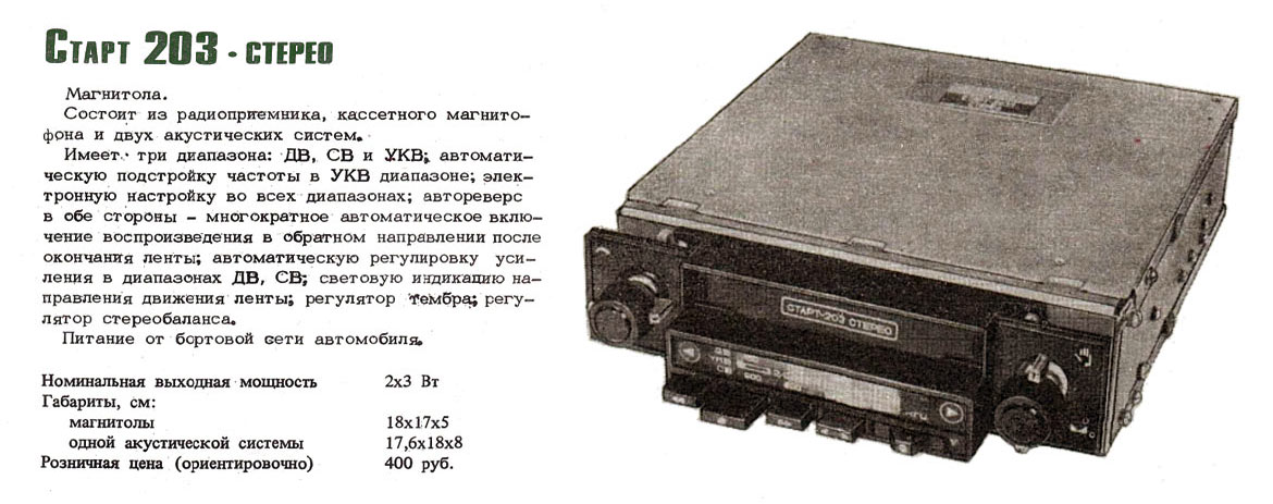 Автомагнитола *Cтарт-203 стерео* с 1985 года выпускал Муромский радиозавод. Автомобильная кассетная магнитола **Старт-203-стерео** выпускалась в нескольких вариантах, буква или цифра после наименования обозначала автомобиль для которого она предназначалась. От буквы и цифры изменялся только способ крепления в автомобиле, основная же конструкция и схема МЛ была неизменной. Магнитола предназначена для установки в автомобили Жигули, Москвич, Волга. Она рассчитана на приём радиостанций на автомобильную штыревую антенну типа **АР-106** в диапазонах ДВ, СВ и УКВ, а так же на воспроизведение фонограмм, записанных на кассетах МК-60. Магнитола имеет электронную настройку, АПЧ в диапазоне УКВ, автореверс, световую индикацию направления движения ленты, регуляторы тембра и стереобаланса. В магнитоле **Старт-203А-стерео** имеется автоматический переход на приём при окончании ленты, с индикацией. В каждой из АС установлены головки 4ГД-53. Для автомобиля ГАЗ-3102 в комплект входило четыре АС с головками 3ГД-42. Чувствительность, мкВ: ДВ 160, СВ 50, УКВ 4. Селективность ДВ, СВ 36 дБ. Коэффициент детонации ± 0,4%. Диапазон рабочих частот звука по тракту магнитной записи 63...10000 Гц, по УКВ-ЧМ тракту 100...10000 Гц. Номинальная выходная мощность 2х3 Вт. Габариты модели 190х170х54 мм. Вес 2,1 кг. Завод одновременно, но в гораздо меньшем количестве выпускал полный аналог магнитолы модель **Былина-203-стерео**.