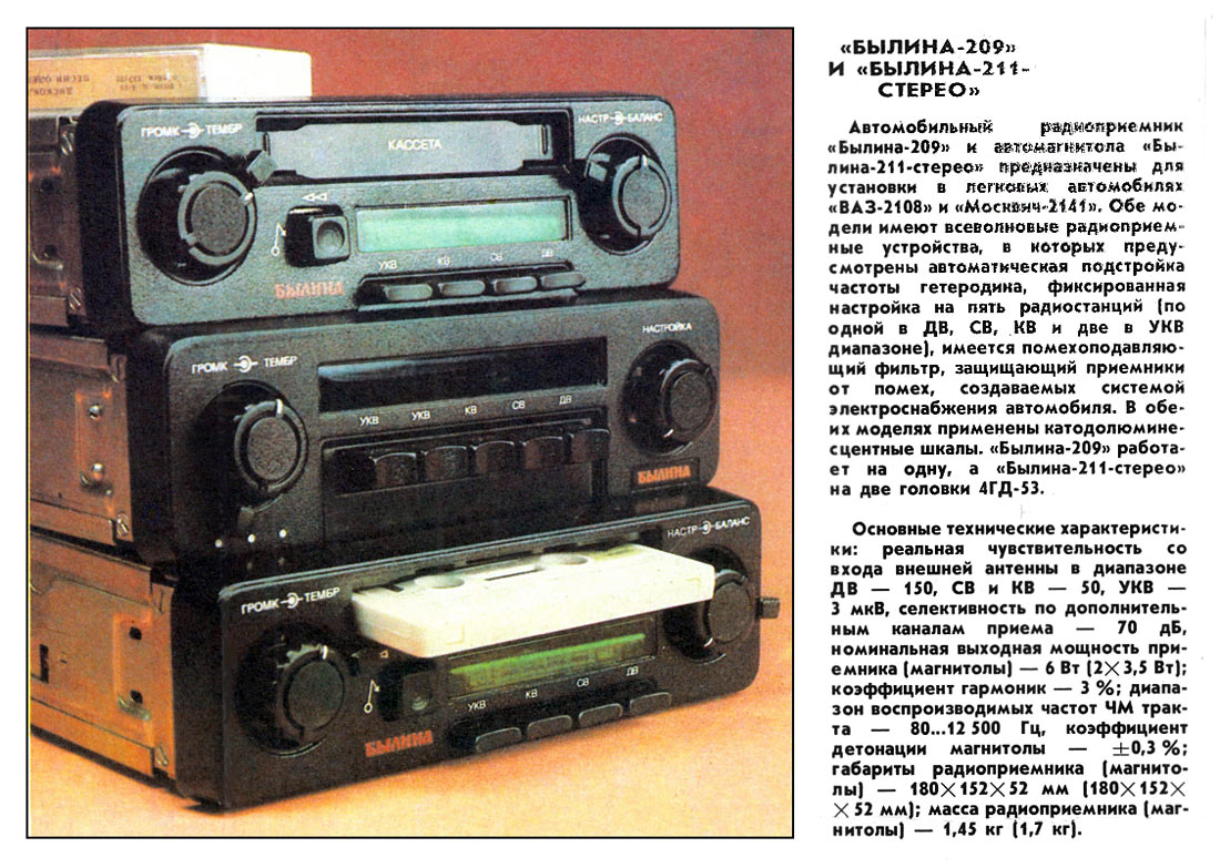 Автомобильный радиоприёмник *Былина-209* с 1986 года выпускал Муромский радиозавод. Радиоприёмник предназначен для установки в автомобили **ВАЗ-2108** и **Москвич-2141**. В нём имеется автоматическая подстройка частоты гетеродина, фиксированная настройка на пять заранее настроенных радиостанций, по одной в диапахонах ДВ, СВ, KB и две в УКВ-ЧМ, имеется помехоподавляющий фильтр, защищающий приёмник от помех системы зажигания. В радиоприёмнике применена катодолюминесцентная шкала настройки. Работает радиоприёмник на выносную АС, состоящей из одной головки 4ГД-53. Чувствительность со входа внешней антенны в диапазонах: ДВ 150, СВ и KB 45, УКВ 3 мкВ, селективность по каналам 70 дБ, номинальная выходная мощность 6, максимальная 10 Вт. Диапазон воспроизводимых частот, в АМ тракте 100...3500 Гц, ЧМ тракте 80...12500 Гц. Напряжение питания от 10,8 до 13,8 вольт. Габариты радиоприёмника 180х152х52 мм. Масса 1,5 кг.