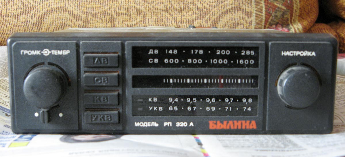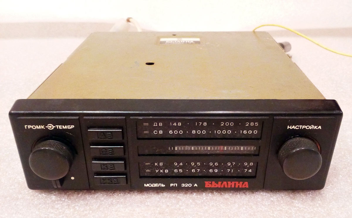 Радиоприёмник автомобильный *Былина РП-320А* выпускал с 1994 года ОАО *Муромский радиозавод*. Радиоприёмник выпускали в нескольких вариантах, обозначавшиеся цифрами, например 33. От варианта зависел диапазон УКВ: 65...74 или 88...108 МГц, а также для какого автомобиля предназначен приёмник. У нас это автомобили ВАЗ 2108,09. Диапазоны ДВ, СВ, КВ (9,5...9,8 МГц) и УКВ. Переключение диапазонов электронное с индикацией. Регулятор тембра по ВЧ трёхпозиционный. Шкала с подсветкой. Подробнее о модели смотрите в инструкции по эксплуатации.