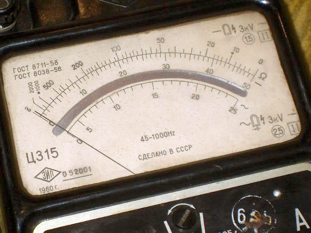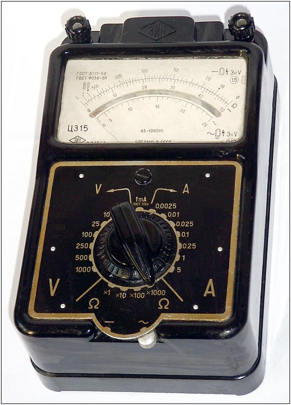 Комбинированный измерительный прибор *Ц-315* с I-кв 1959 года выпускал Краснодарский ЗИП. Комбинированный измерительный прибор **Ц-315** предназначен для измерений значений постоянного или переменного напряжения, тока и сопротивлений. Диапазоны измеряемых напряжений лежат в пределах от 0 до 1000 вольт, силы тока от 0 до 5 ампер, сопротивлений от 0 до 1 мегома, а с внешним питанием в 30...40 В и больших значений, до 10 мегом. Омметр измерительного прибора питается от трёх элементов типа ФБС-0,25.