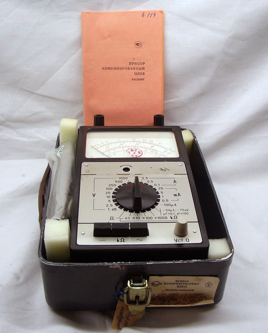 Комбинированный прибор *Ц-4315* с 1978 года выпускал Сарапульский завод им. Орджоникидзе. Предназначен для измерения тока и напряжения в цепях постоянного и переменного тока синусоидальной формы частотой 45...20.000 Гц, сопротивлений переменному току и уровня передачи. Характеристики Входное сопротивление прибора Ц4315 при измерении: постоянного напряжения — 20000 Ом/В; переменного напряжения — 2000 Ом/В. Основная погрешность мультиметра Ц3415 нормируется в диапазоне температур от +15 до +25°С для прибора Ц4315. Рабочий диапазон температур прибора Ц3415 от минус 10 до плюс 40°С, относительная влажность до 80% (при температуре +30°С). Предельные условия транспортирования мультиметра Ц3415 от минус 40 до плюс 60°С, относительная влажность до 95% (при температуре +30°С). Имеется возможность расширения диапазона измерения относительного уровня переменного напряжения. Основная погрешность определяется при нормальных значениях влияющих величин и не превышает: ±2,5% от конечного значения шкалы при измерении на постоянном токе; ±2,5% от длины рабочей части шкал «Ω, pF», «кΩ, pF», равных соответственно 59 и 79 мм при измерении сопротивления.