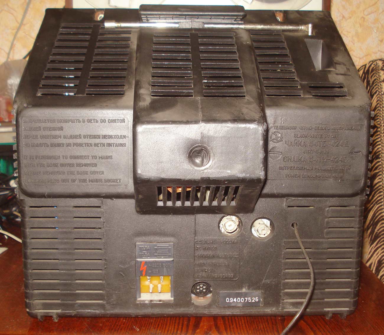 Телевизионный приёмник ч/б изображения *Чайка 34ТБ-424Д* с 1997 года выпускало Новгородское ОАО *Нител*. ТВ предназначен для приёма программ в МВ и ДМВ диапазонах в стандартах B/G и D/K. Чувствительность модели в МВ диапазоне 40 мкВ, в ДМВ - 70 мкВ. Встроенная память позволяет запомнить до 40 каналов. Разрешающая способность 350 линий. Номинальная выходная мощность канала звука 0,5 Вт. Диапазон частот звука 350...4000 Гц. Питание от сети переменного тока напряжением от 198 до 242 В или от источника постоянного тока, напряжением 12 В (аккумулятора). Потребляемая мощность 100 и 70 Вт соответственно. Габариты модели 310х382х266 мм, вес 6 кг. Имеется пульт ДУ.