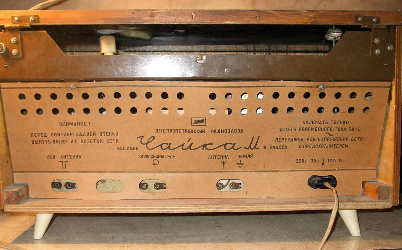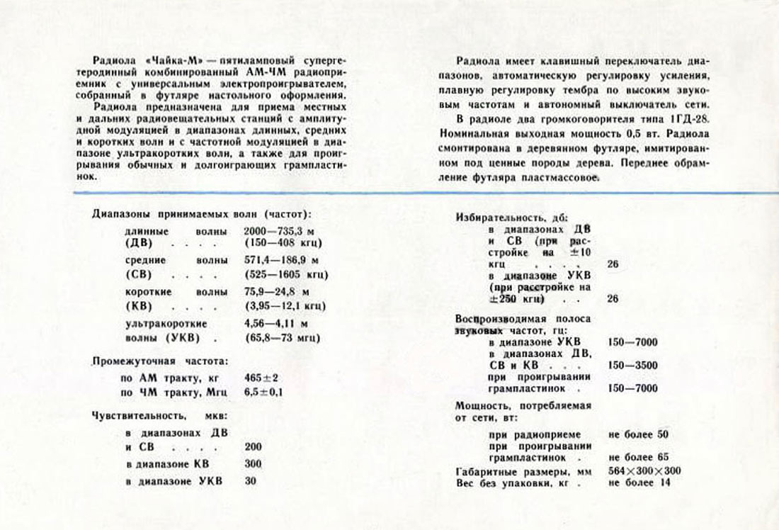 Радиола сетевая ламповая *Чайка-М** с начала 1965 года выпускалась Днепропетровским радиозаводом. Радиола 3-го класса *Чайка-М* - предназначена для приёма радиостанций в диапазонах ДВ, СВ, КВ, УКВ и для проигрывания грампластинок при скорости вращения диска 33, 45 и 78 об/мин. В радиоле применены лампы: 6НЗП, 6И1П, 6К4П, 6Н2П, 6П14П. ПЧ AM тракта 465 Кгц, ЧМ 6,5 Мгц. Чувствительность в диапазонах: ДВ, СВ 200 мкВ, KB 300 мкВ, УКВ 30 мкВ. Избирательность в диапазонах ДВ, СВ - 26 дБ. При приёме радиола воспроизводит полосу частот в диапазонах АМ 150...3500 Гц, в диапазоне УКВ и при проигрывании пластинок 150...7000 Гц. Питание от сети переменного тока 127 или 220 вольт. Потребляемая мощность при приёме 50 Вт, при проигрывании грампластинок 65 Вт. Цена модели 67 рублей 85 коп.
