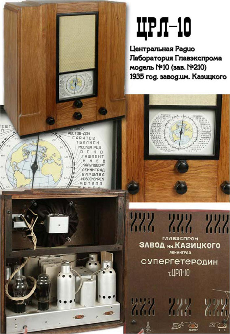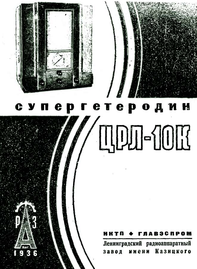 Радиоприёмник сетевой ламповый *ЦРЛ-10* и *ЦРЛ-10К* с 1935 и 1936 года выпускал Ленинградский завод имени Козицкого. С осени 1935 года выпускался первый массовый серийный отечественный супергетеродин **ЦРЛ-10** (Центральной Радио-Лаборатории 10-я разработка). Схема радиоприёмника выполнена на 5-ти радиолампах с 4-х вольтовым накалом типов СО-183, СО-182, СО-193, СО-187. В выпрямителе установлена лампа ВО-116. Радиоприёмник *ЦРЛ-10* сетевой, 110, 127, 220 В, работает в диапазонах: ДВ 740...1900 м, и СВ 220...550 м. Чувствительность радиоприёмника 150...500 мкВ. Избирательность по соседнему каналу 24 дБ, по зеркальным каналам 8...12 дБ. ПЧ равна 110 кГц. Номинальная выходная мощность радиоприёмника 1 Вт. Потребляемая от сети мощность 100 Вт. Имеются гнёзда для подключения внешнего звукоснимателя. Регулятор громкости и тембра ВЧ плавные. Верньерное устройство применено с замедлением 10:1. Известно о двух незначительных схемных модернизациях приёмника *ЦРЛ-10*. С 1936 года завод выпускал модернизированный приёмник *ЦРЛ-10К* (Коротковолновый), по конструкции, внешнему виду и электрической схеме аналогичный модели *ЦРЛ-10*, имеющий диапазоны ДВ и СВ, но с добавлением КВ диапазона 19...46 метров. Границы диапазона СВ были скорректированы. К сожалению выпуск обоих приёмников не стал массовым из-за отсутствии современных радиоэлементов и неготовности смежных предприятий наладить их производство. Подробнее о моделях в приведённой ниже документации.