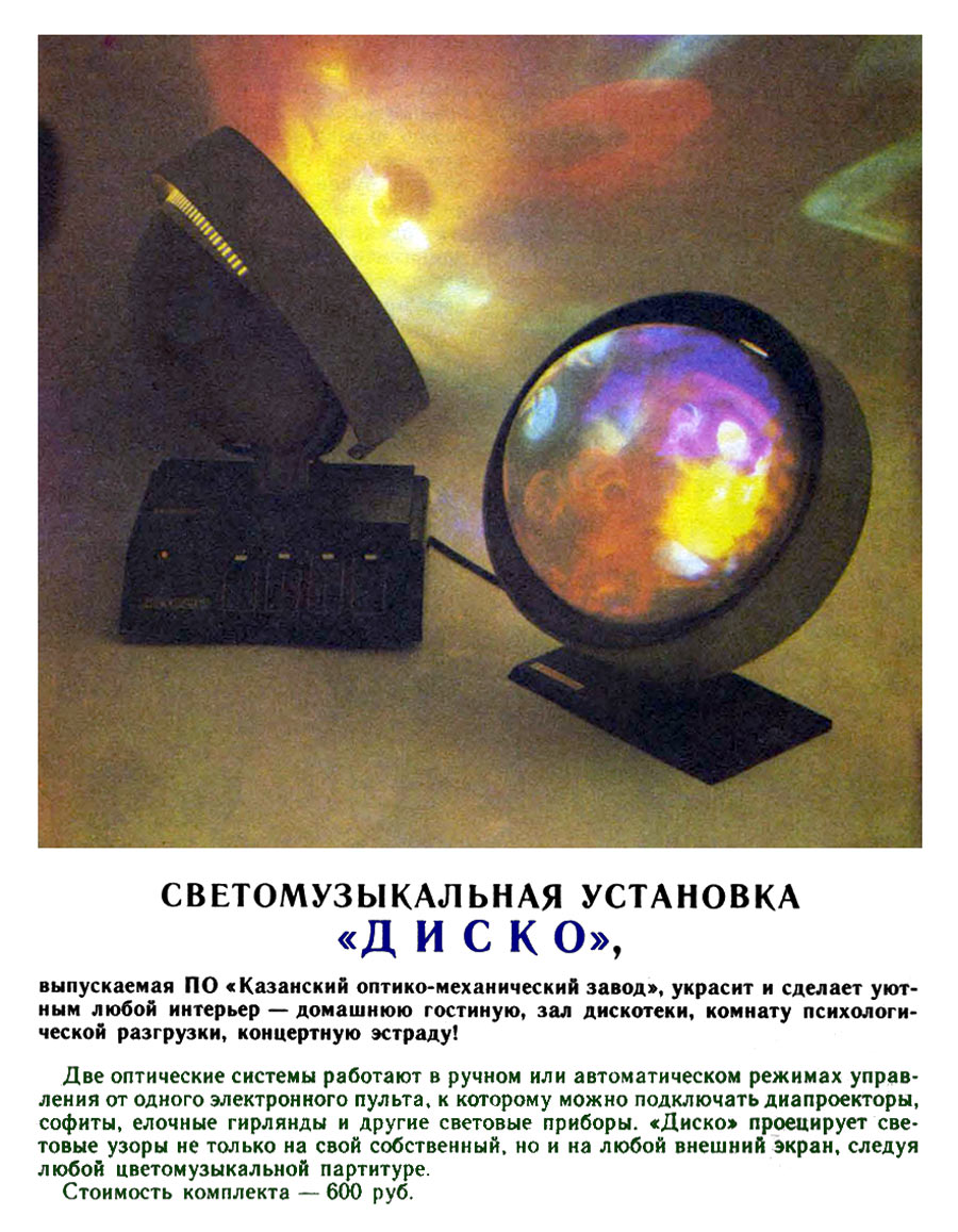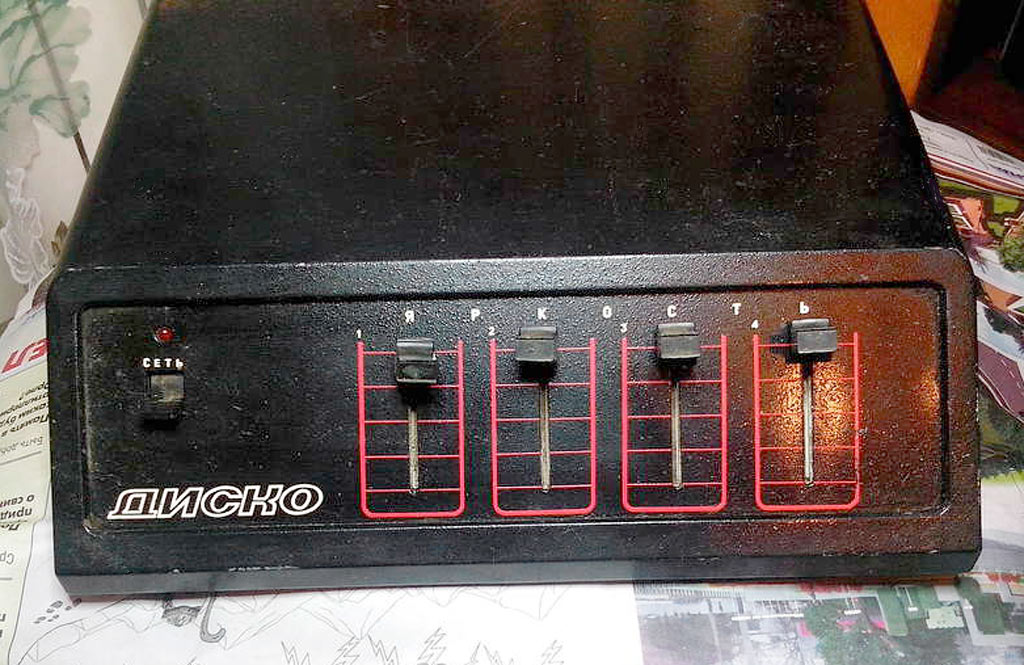 Светомузыкальная установка *Диско* выпускалась предположительно с 1989 года ПО *Казанский оптико-механический завод*.