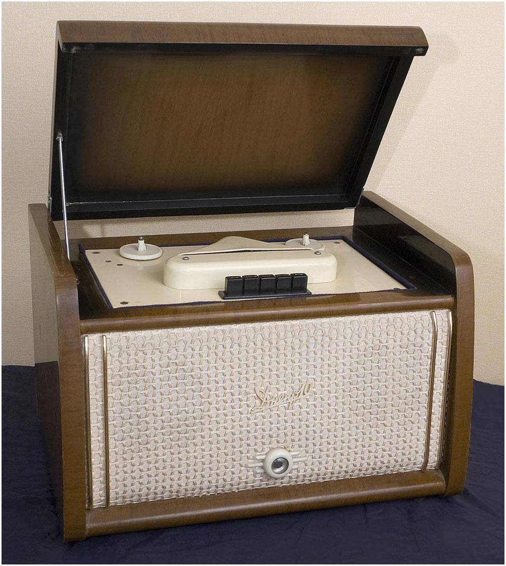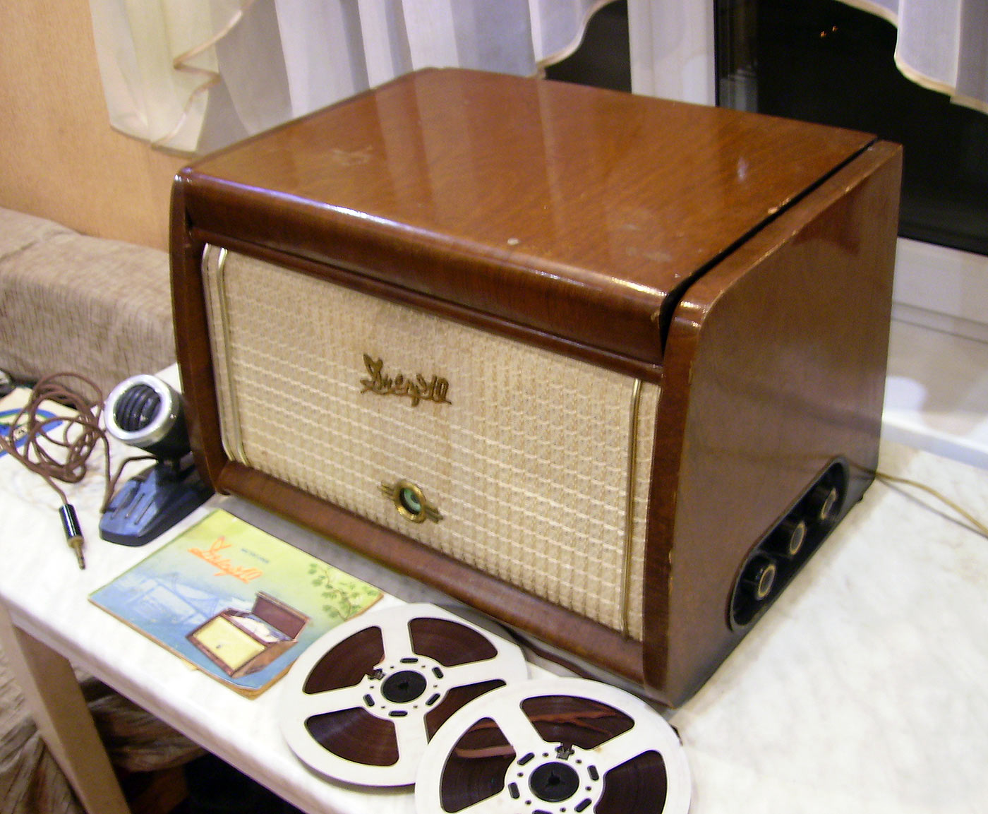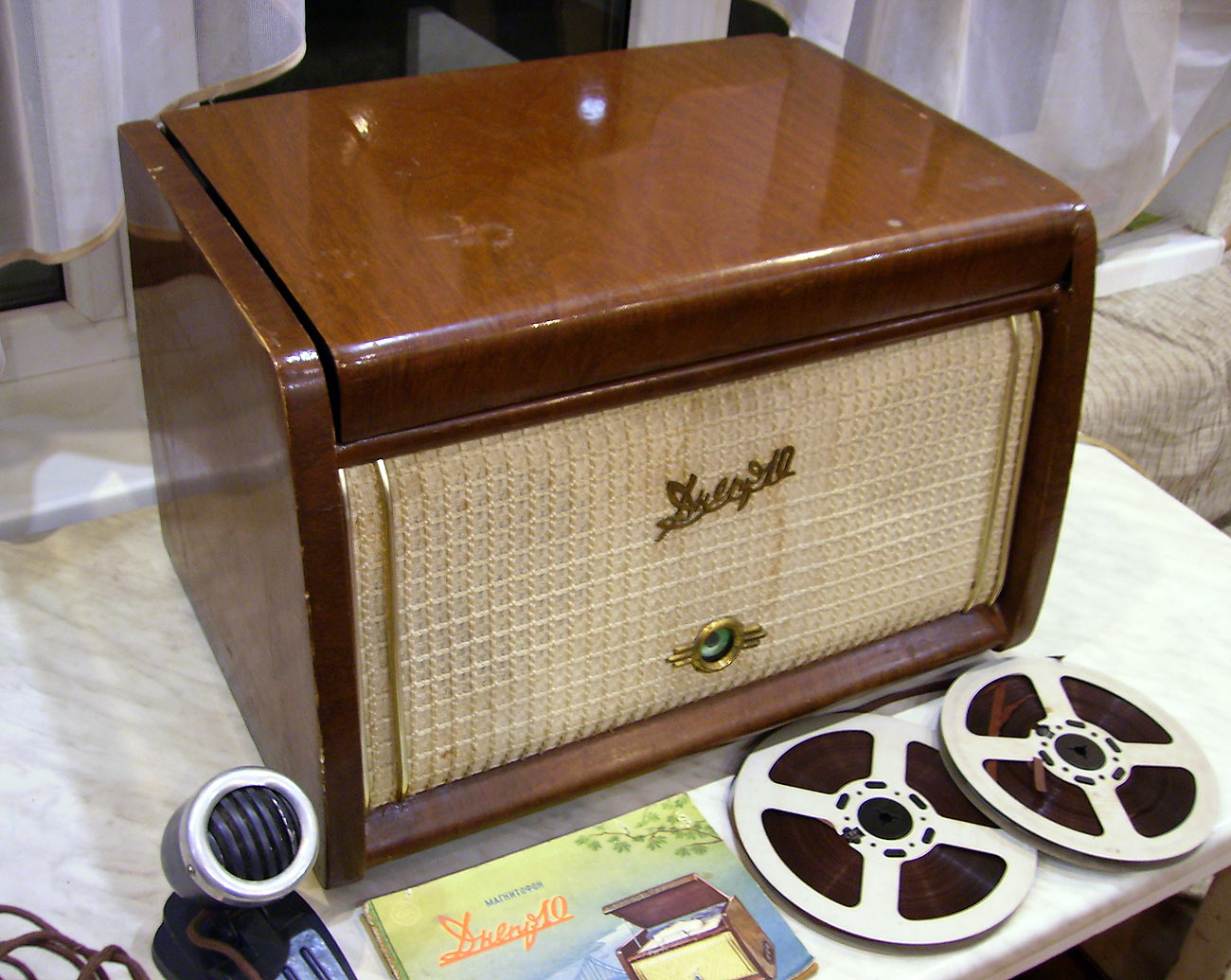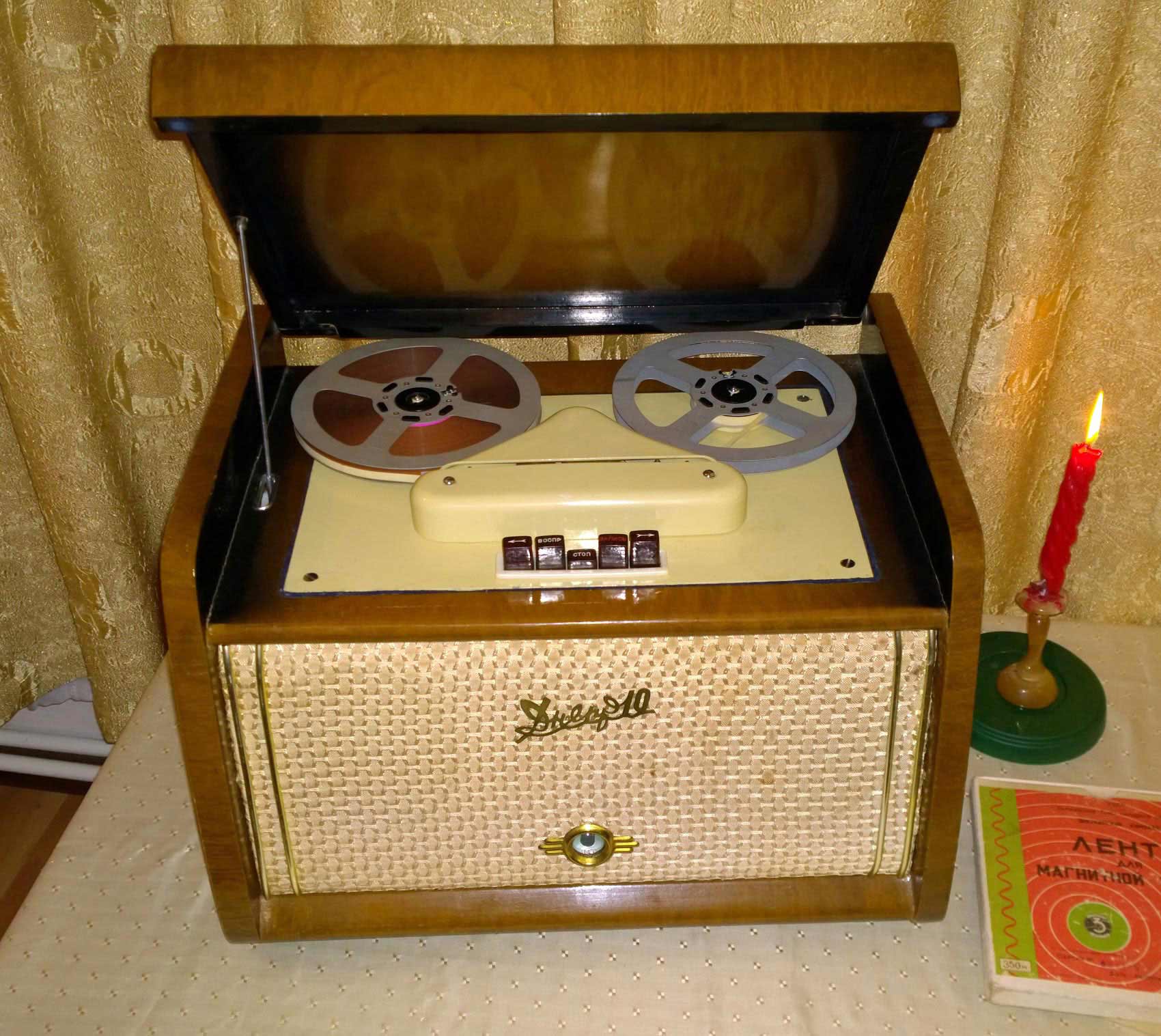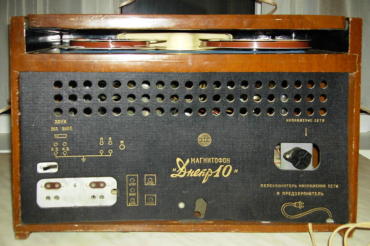 Настольный магнитофон *Днепр-10* с 1958 года выпускал Киевский завод радиоаппаратуры. Магнитофон создан на базе предыдущей модели **Днепр-9** и по конструкции и внешнему оформлению практически совпадает с ним. Магнитофон предназначен для записи и прослушивания двухдорожечных фонограмм на скорости протяжки магнитной ленты 19,05 см/сек. Ёмкость катушек с магнитной лентой типа 1 или СН - 350 метров. Время звучания или записи 30 минут на каждой дорожке. Магнитофон *Днепр-10* имеет ускоренную перемотку магнитной ленты в обе стороны. Диапазон записываемых и воспроизводимых звуковых частот на указанных типах лент 50...10000 Гц. Коэффициент нелинейных искажений на выходе громкоговорителей 5%. Номинальная выходная мощность 2,5, максимальная 6 Вт. Питание от сети 127/220 В. Потребляемая мощность 100 Вт. Габариты магнитофона 510х350х320 мм. Масса 28 кг.