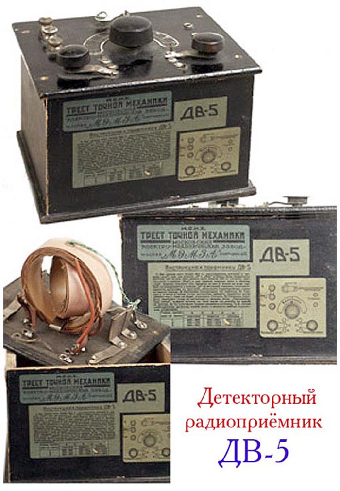 Радиоприёмник детекторный **ДВ-5** (Детекторный, Вещательный, 5-я модель) с 1929 года выпускал Московский ЭМЗ. Приёмник пришёл на смену модели *ДВ-4*. Основное отличие от приёмника *ДВ-4*, это жёсткое крепление детектора, сначала на верхней панели, а позднее и внутри футляра. Радиоприёмник *ДВ-5* работает в диапазоне 300...2000 метров. Грубая перестройка на частоту осуществляется переключением витков а плавная вариометром. Отдельный переключатель регулирует связь с антенной. В радиоприёмнике применён детектор ДС-4. Рекомендуемая антенна - это диполь или длинный провод от 40 м. Выход аппарата нагружен высокоомными телефонами. Радиоприёмник **ДВ-5** оформлен в крашенном деревяном футляре, с наклеенной сбоку инструкцией.