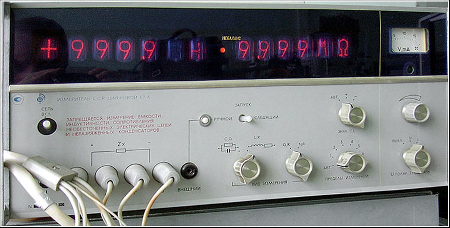 Измеритель LCR цифровой **Е7-8** выпускался предположительно с 1977 года. Измеритель LCR обеспечивает измерение параметров конденсаторов, катушек индуктивностей. резисторов, различных элементов радиотехнических цепей с цифровым отсчетом измеряемых величин и выводом информации в коде 8-4-2-1. Прибор может использоваться для определения коэффициента деления трансформаторов, проверки качества экранирования, измерения емкости диодов и переходного сопротивления переключателей. Функции LRC могут разширены (измерения температуры, давления, влажности и т.д.) за счет использования датчиков, преобразующих измеряемую физическую величину в емкость, индуктивность, сопротивление или тангенс угла диэлектрических потерь. Принцип измерения основан на мостовом методе с фазочувствительными детекторами уравновешивания. Отсчет измеряемой величины четырехзначный.