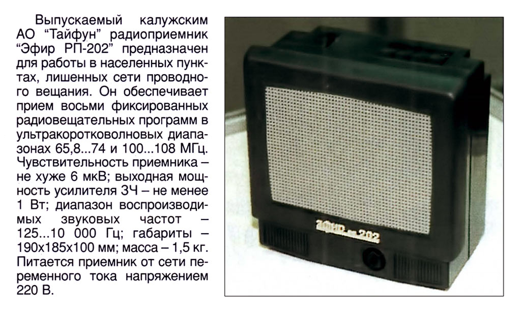 Стационарный УКВ радиоприёмник *Эфир РП-202* выпускался возможно с 1996 года Калужским АО *Тайфун*. Работает приёмник от сети переменного тока, напряжением 220 вольт. Аппарат имеет восемь фиксированных настроек; по четыре в диапазонах 65,8...74 МГц и 100...108 МГц. Чувствительность около 6 мкВ. Максимальная выходная мощность усилителя 1 Вт. Диапазон воспроизводимых частот 125...10000 Гц. Габариты модели - 190х185х100 мм. Вес 1,5 кг.