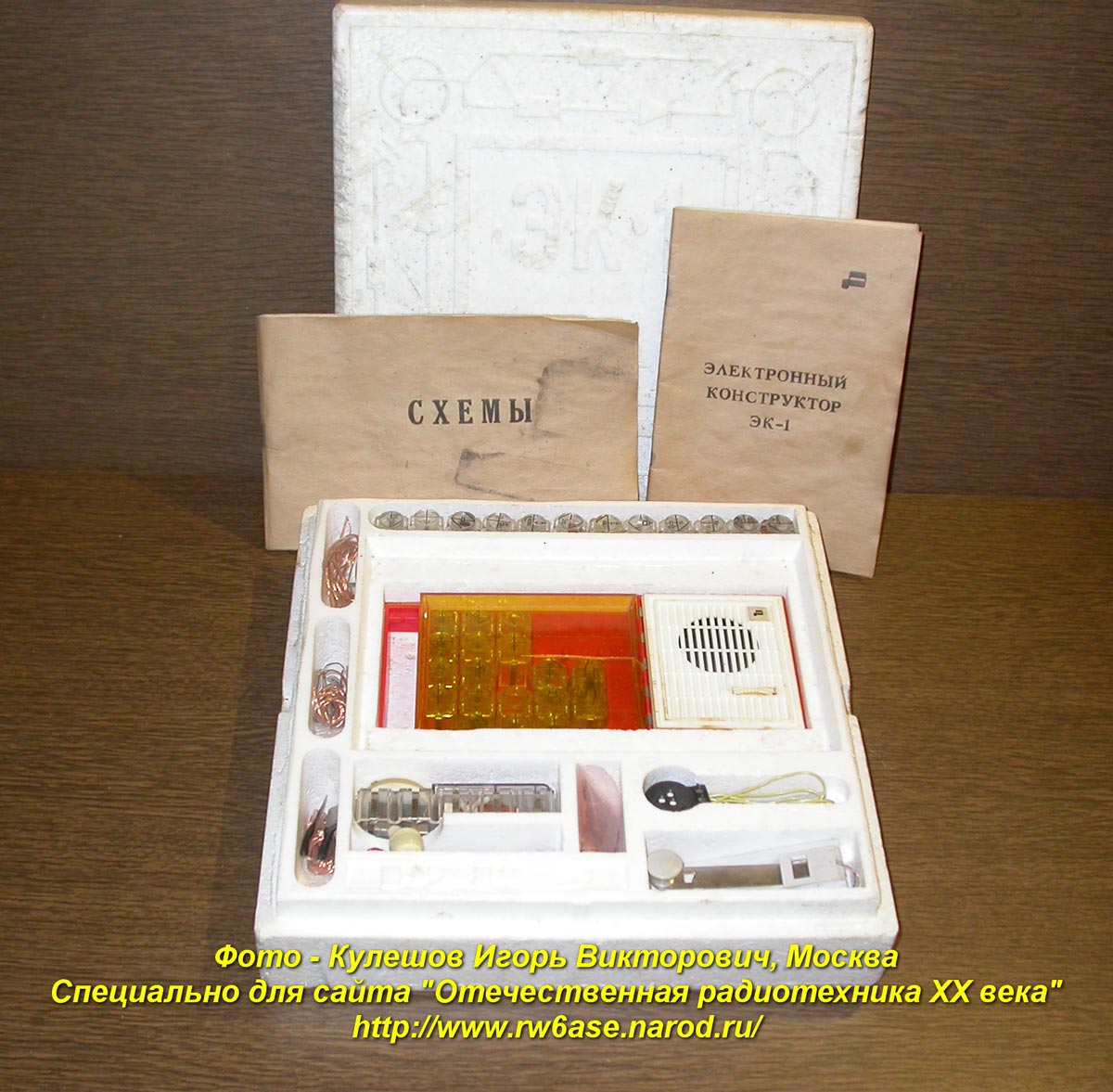 Электронный конструктор *ЭК-1* с 1979 года выпускался Смоленским А/Я 104. Электронный конструктор предназначен для детей среднего и старшего школьного возраста для закрепления знаний полученных на уроках физики, а так же развития навыков по радиоэлектронике. С помощью конструктора можно собрать сорок электронных схем, узнать принцип их работы как в общем, так и отдельных элементов ЭК. Подробнее в руководстве к конструктору.