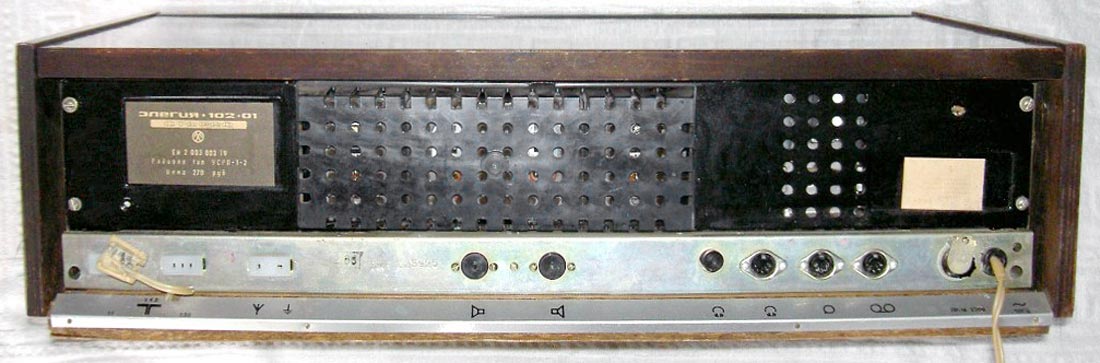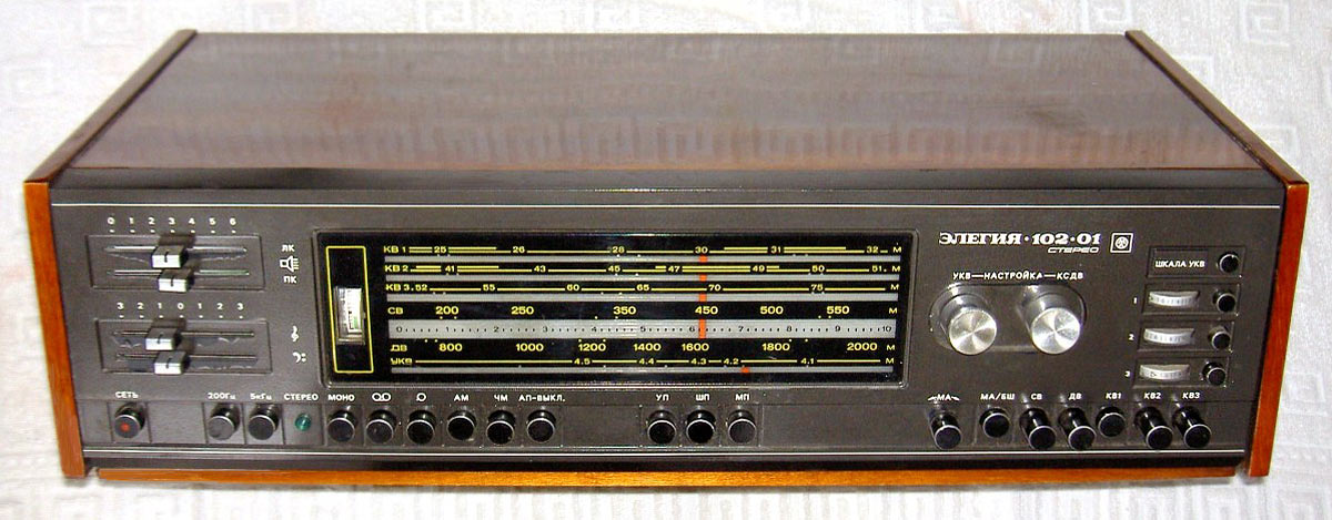 Стационарная транзисторная радиола *Элегия-102-01-стерео* с 1984 года выпускалась Муромским заводом РИП. Радиола **Элегия-102-01-стерео** является модернизацией предыдущей модели этого же завода **Элегия-102-стерео**. Все изменения коснулись в основном лишь внешнего оформления радиолы. Радиола состоит из 4-х отдельных блоков: радиоприёмника, проигрывателя и двух АС. Блоки радиолы можно расположить в наиболее удобном сочетании. Радиоприёмник работает в диапазонах: ДВ, СВ, КВ и УКВ. В УКВ диапазоне можно принимать и стереопрограммы. Имеется фиксированная настройка на три радиостанции в УКВ-ЧМ диапазоне. 3-х скоростное ЭПУ способно воспроизводить моно и стереопластинки. Имеется возможность для подключения магнитофона и стереотелефонов. Чувствительность в диапазонах: АМ - 150 мкВ, ЧМ - 5 мкВ. Номинальная выходная мощность - 2х6 Вт. Максимальная - 2х20 Вт. Питание осуществляется от сети переменного тока 50 Гц, 220 или 127 вольт. Потребляемая мощность при приёме - 45 Вт, при работе ЭПУ - 55 Вт. Полоса звуковых частот в АМ диапазонах - 63...4000 Гц, ЧМ 63...12500 Гц. Габариты приёмника 624х318х171 мм, ЭПУ 316х409х170 мм. Общий вес 30 кг.