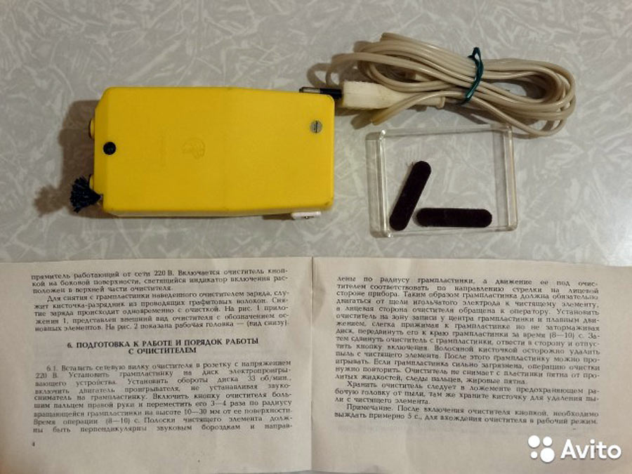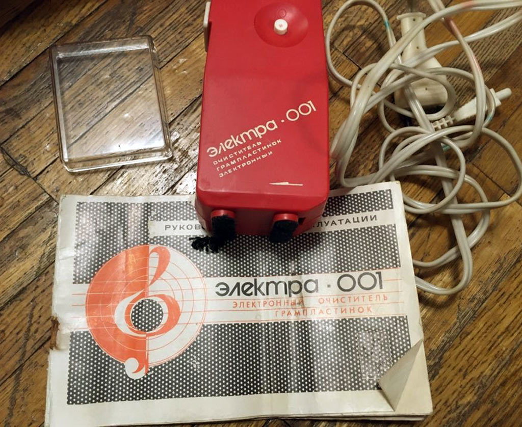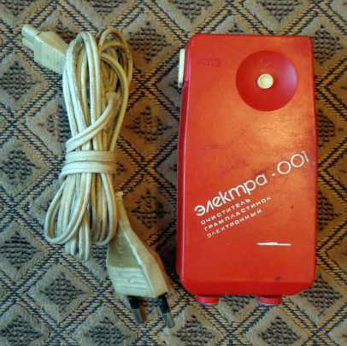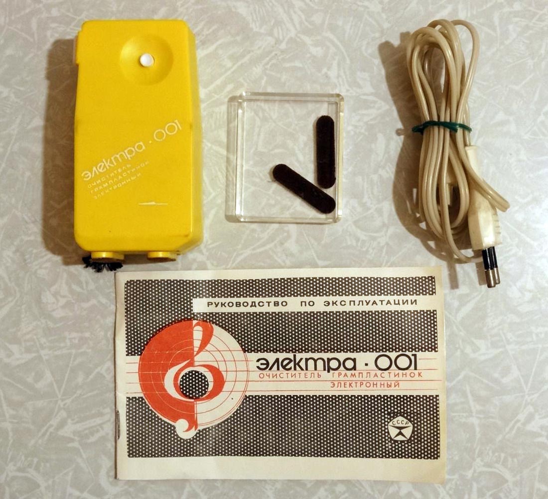 Электронный очиститель грампластинок *Электра-001* выпускался с 1990 года Рязанским радиозаводом. Прибор предназначен для работы с электропроигрывающими устройствами. С его помощью можно удалить пыль и снять статический заряд электричества с грампластинок. Питается прибор от сети напряжением 220 В. Потребляемая им мощность не превышает 0,5 Вт. Время очистки одной стороны пластинки не более 20 секунд. Габариты очистителя - 110х60х45 мм. Масса - 0,25 кг. Цена 11 рублей.
