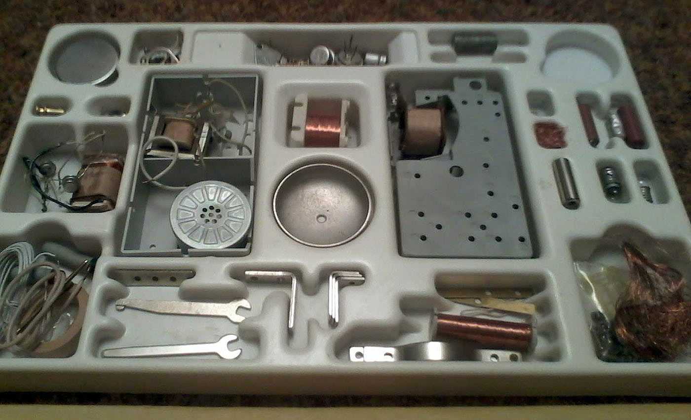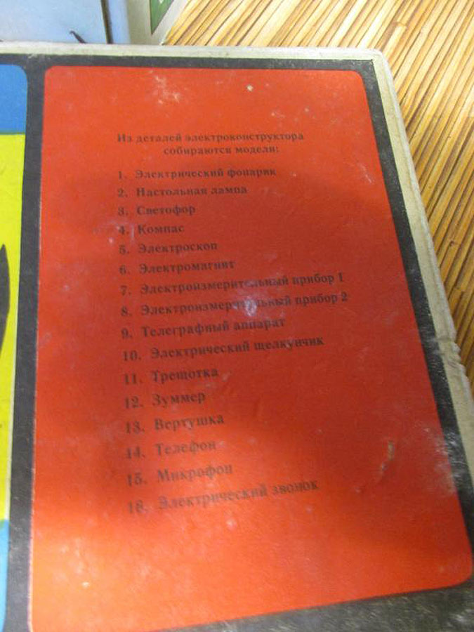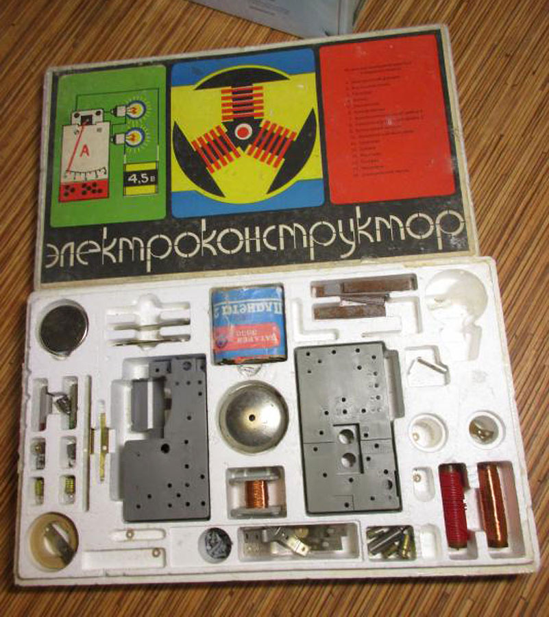 *Электроконструктор* выпускался предположительно с 1978 года. Из деталей конструктора собирались 16 действующих электрических моделей, таких как; электрический фонарь, настольная лампа, светофор, компас, электроскоп, электромагнит, электроизмерительный прибор №1 и №2, телеграфный аппарат, электрический щелкунчик, трещотка, зуммер, вертушка, телефон, микрофон, электрический звонок. ЭК выпускали в 2 вариантах оформления.