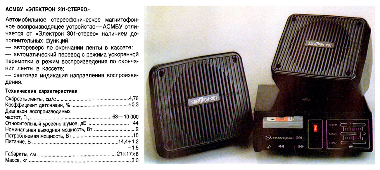 Автомобильное стереофоническое воспроизводящее магнитофонное устройство *Электрон-201-стерео* подготовил к выпуску с 1981 года завод НПО *Ани*, Ереван. Устройство отличается от АСВМУ *Электрон-301-стерео* наличием дополнительных функций.
