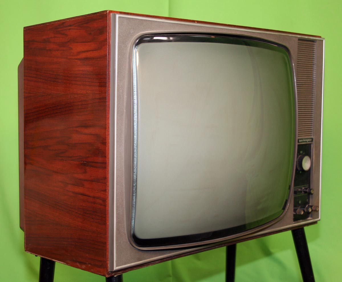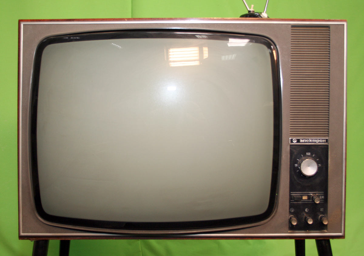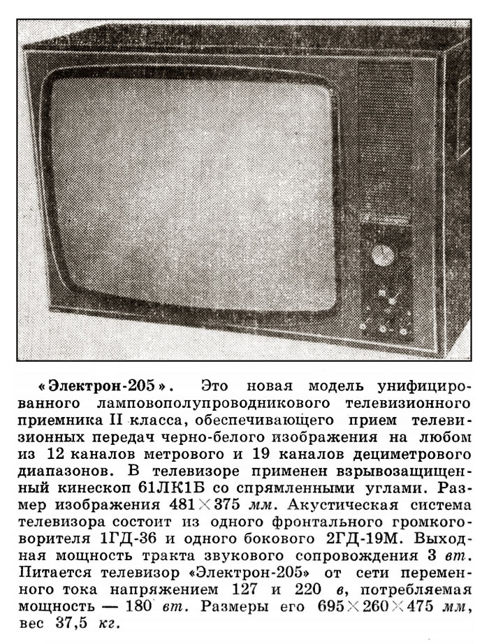 Телевизионный приёмник чёрно-белого изображения *Электрон-205/Д* с 1970 года выпускал Львовский телевизионный завод. Унифицированный телевизор 2 класса **Электрон-205/Д** (тип УЛПТ-61-II-12/11) предназначен для приёма программ телестудий, работающих на любом из 12-ти каналов метрового диапазона, телевизор с индексом **Д** и на любом из 19-ти каналов дециметрового диапазона. В телевизоре применён кинескоп 61ЛК1Б со спрямленными углами. Размер видимого изображения 481х375 мм. Чувствительность модели в диапазоне МВ - 50 мкВ, в ДМВ - 100 мкВ. АС телевизора состоит из двух громкоговорителей, фронтального 1ГД-36 и бокового 2ГД-19М. Номинальная выходная мощность канала звукового сопровождения 1,5 Вт, максимальная 3 Вт. Диапазон звуковых частот - 100...10000 Гц. Питание от сети 110, 127, 220 В. Потребляемая мощность 180 Вт. Размеры телевизора 695х260х475 мм. Вес 37,5 кг. Цена 380 рублей.