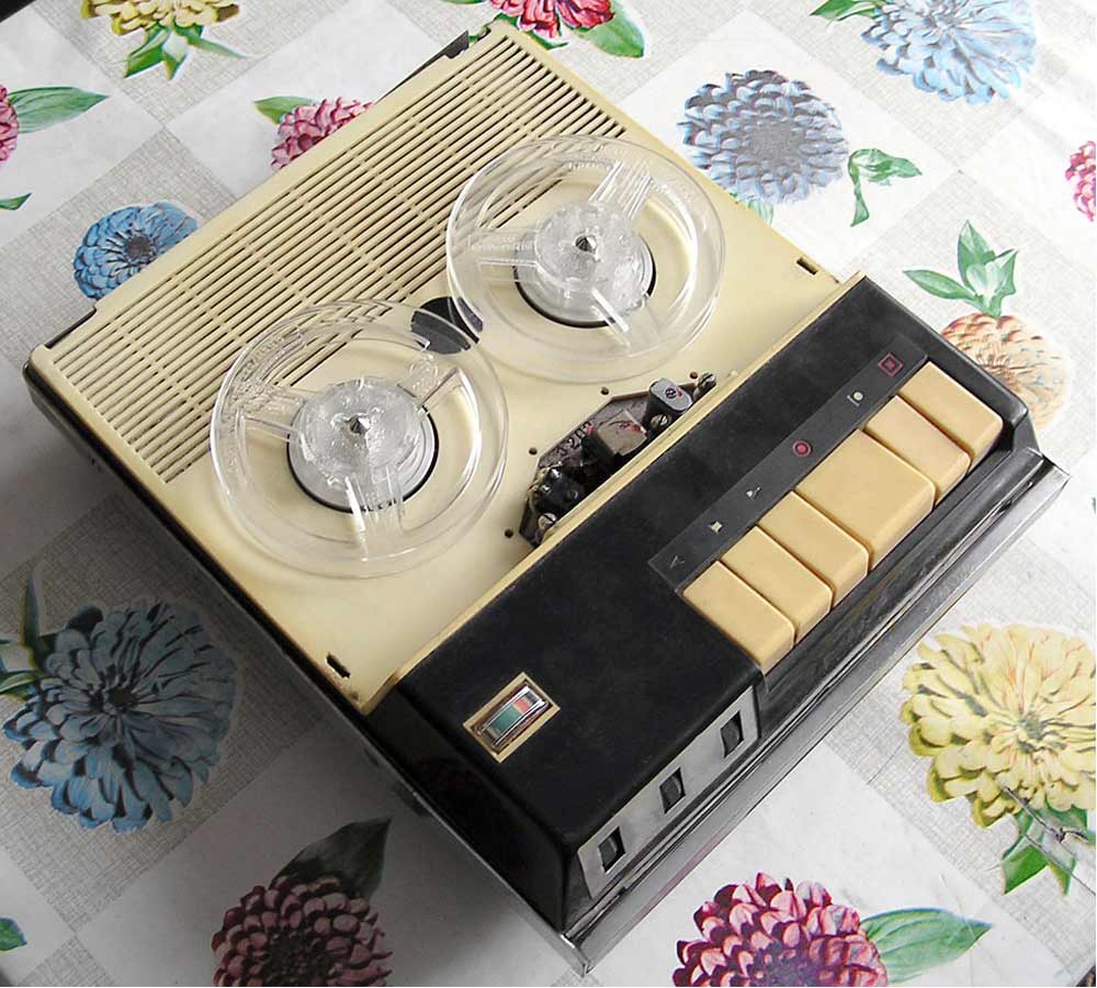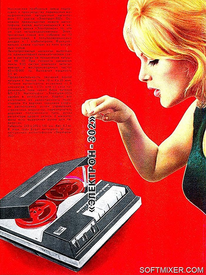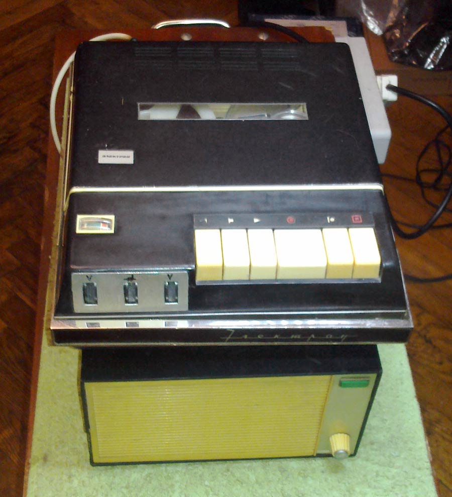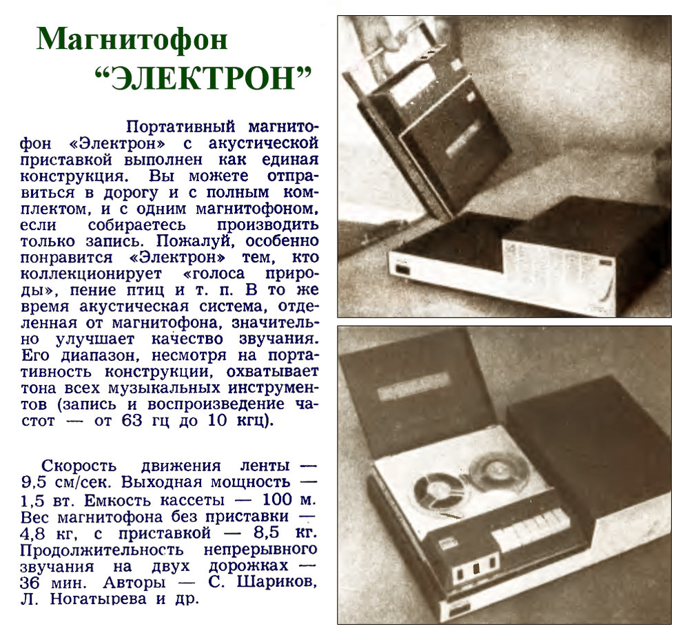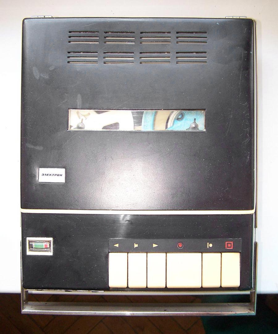 Портативный катушечный магнитофон *Электрон* выпускал с 1969 года Московский приборный завод. Магнитофон создан на базе любительского магнитофона *Электрон-4*, который экспонировался на 21-й Всесоюзной выставке творчества радиолюбителей-конструкторов 1968 года в Москве, был удостоен диплома первой степени и рекомендован для серийного производства. Магнитофон *Электрон* предназначен для записи и последующего воспроизведения фонограм на скорости 9,53 см/сек. Катушки вмещают 100 м. магнитной ленты типа 10. Полоса рабочих частот на ЛВ - 63...10000 Гц. Коэффициент детонации ЛПМ - 0,4%. Номинальная выходная мощность от батарей 0,5 Вт, от сети 1 Вт. Габариты магнитофона 283х290х100 мм, масса с батареями питания и лентой 4,7 кг. С 1972 года завод начал выпуск четырёхдорожечного магнитофона *Электрон-302*, который кроме других головок, переключателя дорожек и соответственно большего времени записи, по конструкции и виду не отличался от базового. Аппараты комплектовались приставкой, в которую входил блок питания от сети и дополнительный громкоговоритель.