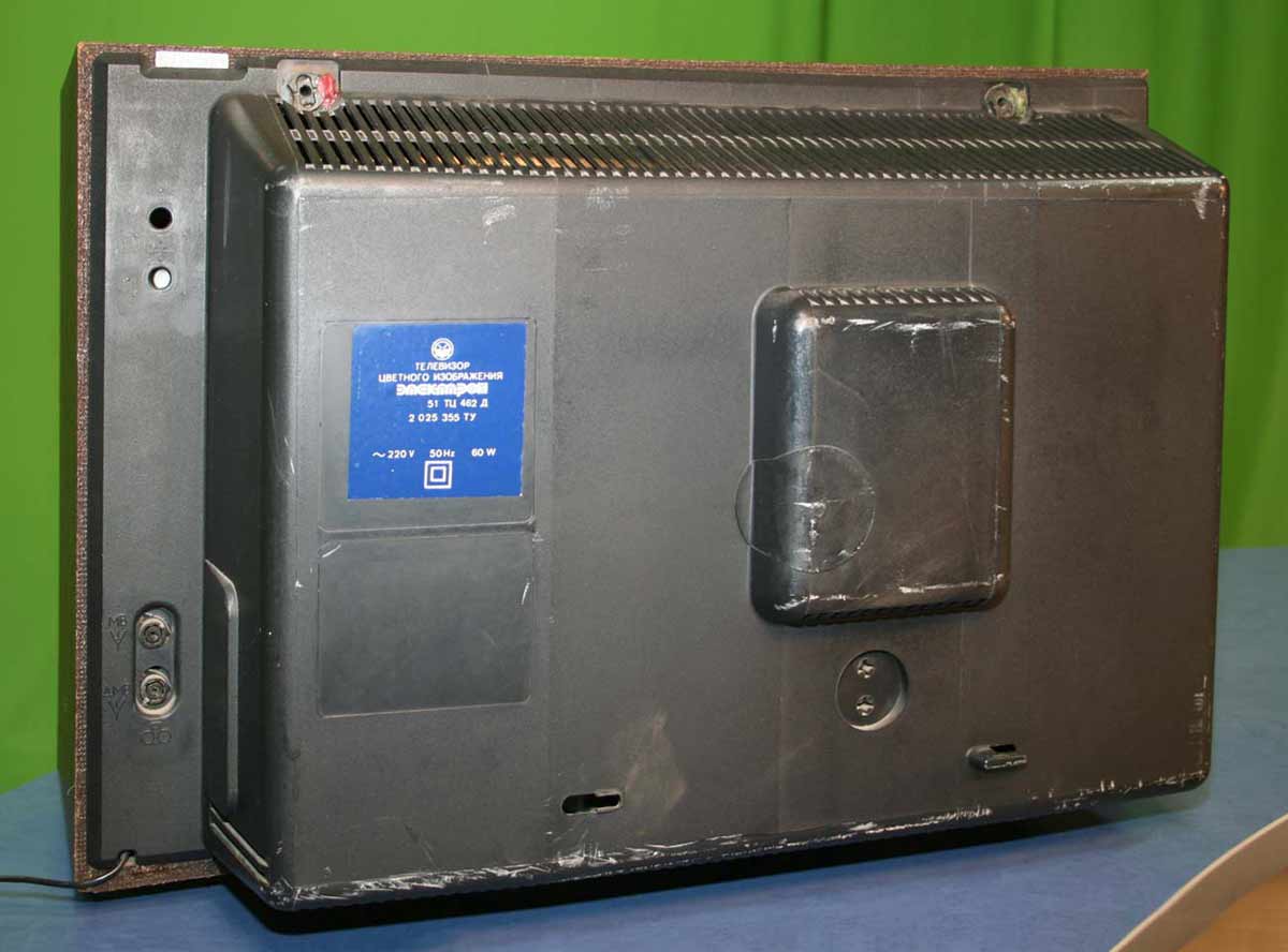 Телевизионный приёмник цветного изображения *Электрон 51ТЦ-462Д* с начала 1993 года выпускало Львовское ПО *Электрон*. Телевизор модульной конструкции на п/п и интегральных микросхемах обеспечивает приём телевизионных программ в цветном и ч/б изображении в МВ и ДМВ диапазонах в системах PAL или SECAM. В телевизоре применён кинескоп с диагональю экрана 51 см и углом отклонения лучей 90°. Телевизор обладают весьма высокой чувствительностью и эффективной схемой АРУ. Выбор программ производится 8 программным электронным устройством со световой индикацией включенной программы. Наличие системы АПЧГ обеспечивает переключение программ без регулировок. Схема обеспечивает работу телевизора при колебаниях напряжения сети в пределах 170...240 В. Телевизор обеспечивает прослушивание звукового сопровождения передач на головные телефоны; его запись на магнитную плёнку; просмотра видеопрограмм с видеомагнитофона. Чувствительность в МВ диапазоне - 40, в ДМВ - 70 мкВ. Номинальная выходная мощность канала звука 1 Вт. Диапазон воспроизводимых звуковых частот 10...10000 Гц. Потребляемая от сети мощность 60 Вт. Габариты телевизора - 455х625х175 мм. Вес 25 кг.