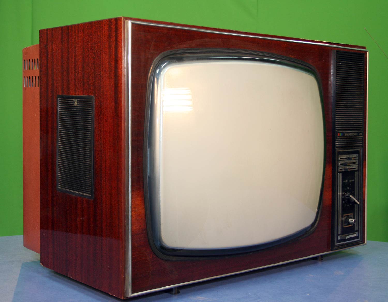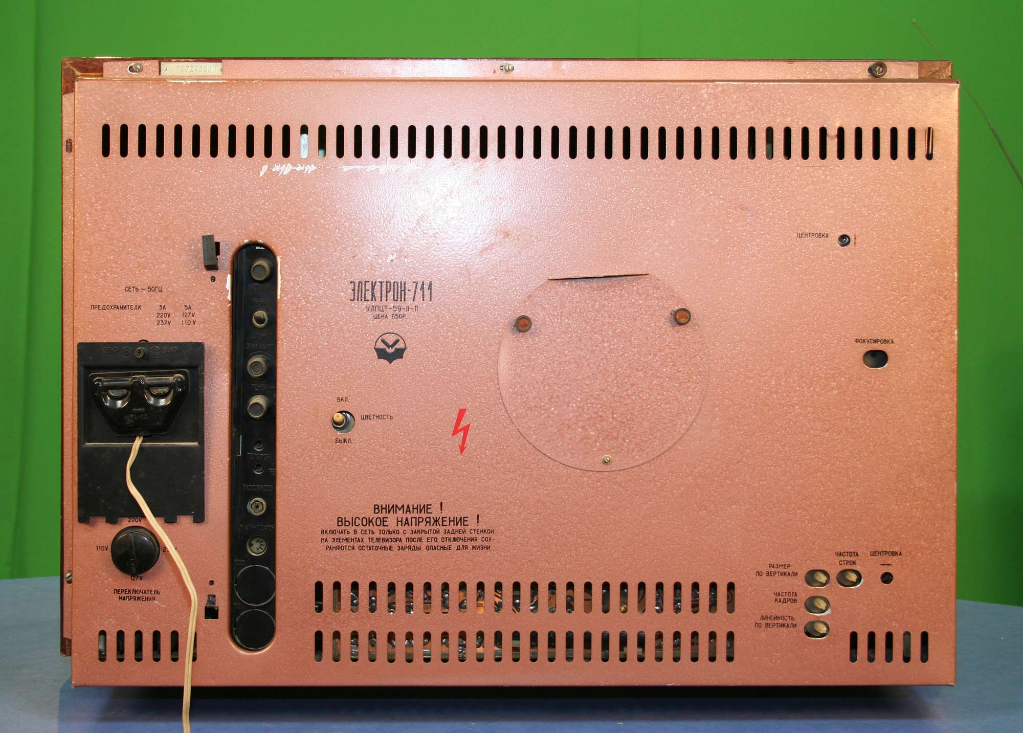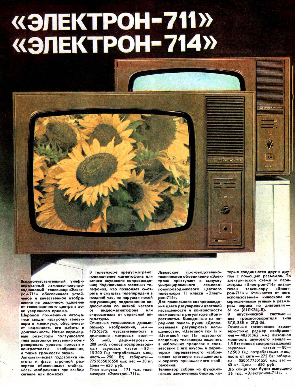 Телевизионный приёмник цветного изображения *Электрон-711/Д* с начала 1975 года выпускало Львовское ПО *Электрон*. Унифицированный стационарный лампово-полупроводниковый цветной телевизор 2 класса **Электрон-711** (УЛПЦТ-59-II-11/10) на кинескопе 59ЛКЗЦ с размером изображения 475x375 мм, предназначен для приёма телевизионных программ в цветном и чёрно-белом изображении. В телевизоре имеется возможность установки блока СКД для приёма в диапазоне ДМВ, а в телевизоре с индексом *Д* блок СКД уже установлен. Чувствительность телевизора в МВ диапазоне - 50 мкВ. Номинальная выходная мощность усилителя - 1,5 Вт. Диапазон воспроизводимых частот - 80...12500 Гц. Потребляемая мощность 260 Вт. Вес ТВ 57 кг, габариты - 535 х 550 х 790 мм. Цена 650 рублей. Корпус облицован ценными породами дерева.