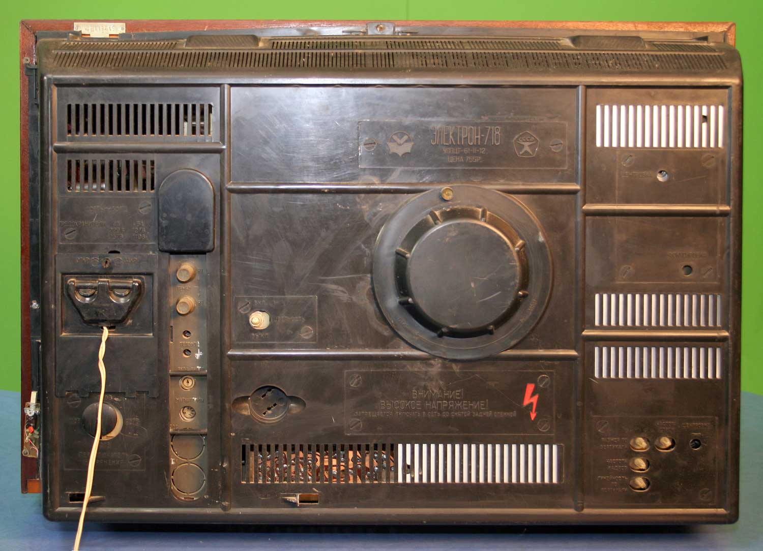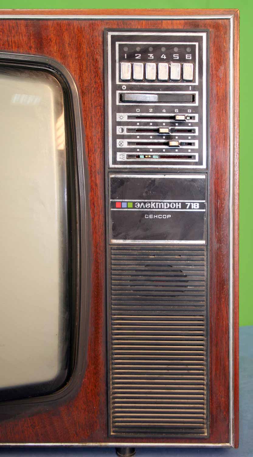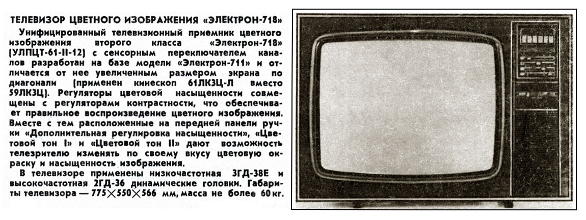 Унифицированные цветные телевизоры 2 класса *Электрон-712* и *Электрон-718* с 1976 года выпускал Львовский телевизионный завод. ТВ рассчитаны на приём цветных и ч/б передач в диапазонах МВ и ДМВ. Модели разработаны на базе ТВ **Электрон-711**, имеют общую схему, конструкцию и оформление, отличаясь от базового сенсорным переключением каналов и размером кинескопа. В телевизоре **Электрон-712** применён кинескоп 59ЛК3Ц, **Электрон-718** 61ЛК3Ц (4Ц). Габариты любой модели 515х540х775 мм. Масса 60 кг. Цена ТВ 725 и 755 рублей.