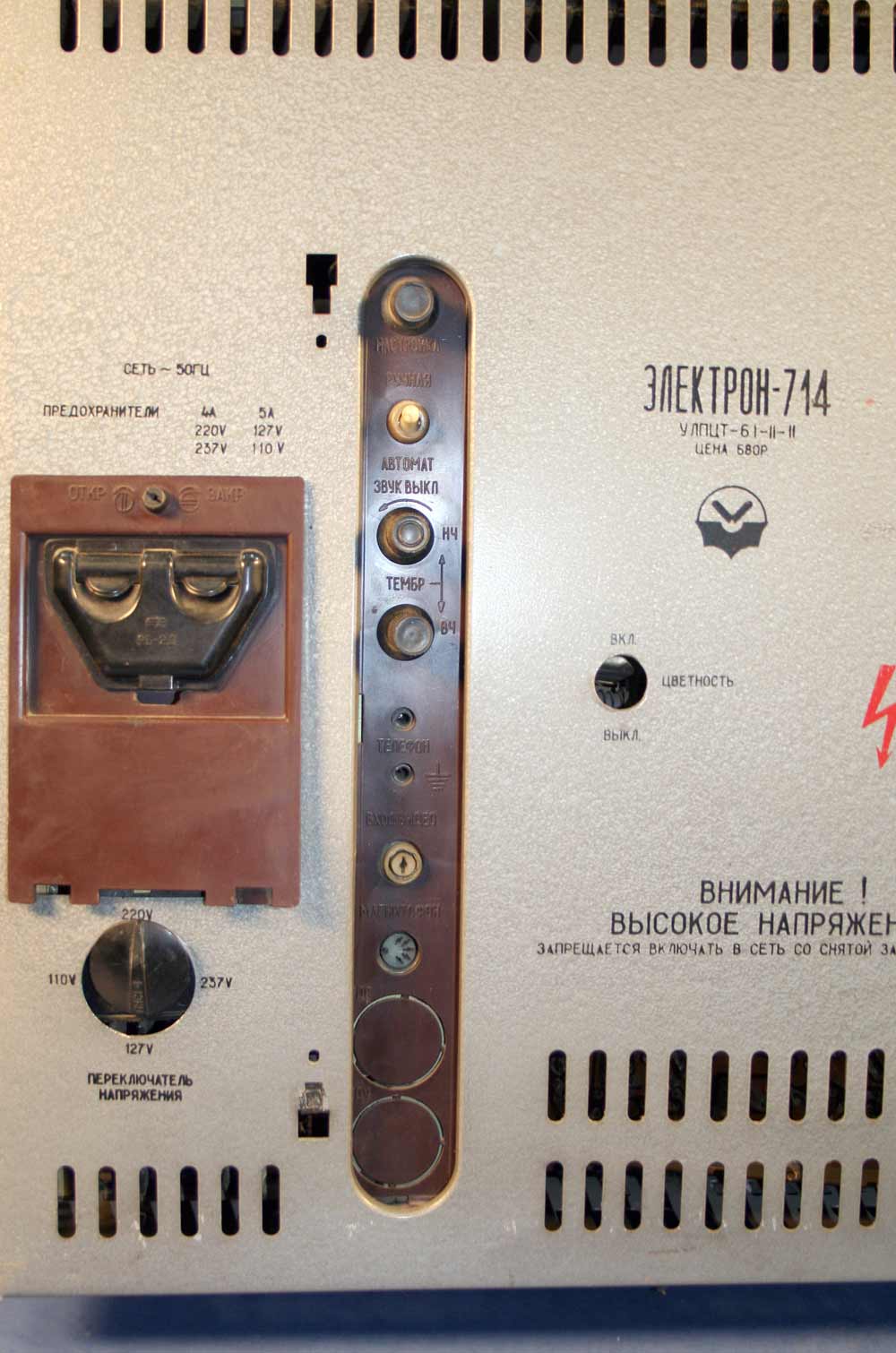 Телевизор цветного изображения *Электрон-714/Д* с начала 1977 года выпускал Львовский телевизионный завод. **Электрон-714** - это унифицированный (УЛПЦТ-61-II-11/0) лампово-полупроводниковый телевизионный приёмник, предназначенный для приёма программ телевидения в цветном и ч/б изображении в диапазонах МВ и ДМВ (*Д*). По такой же унификации, электрической схеме и конструкции, но с другим оформлением заводы СССР выпускали телевизоры марок **Рубин-714**, **Садко-714**, **Рекорд-714**, **Лазурь-714** и другие.