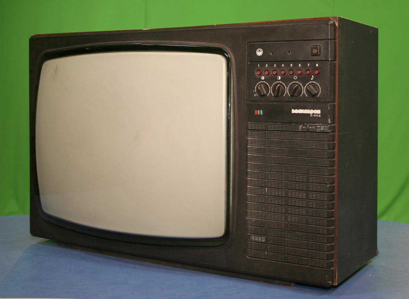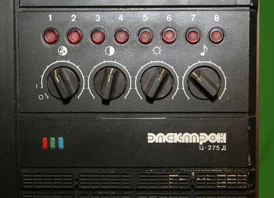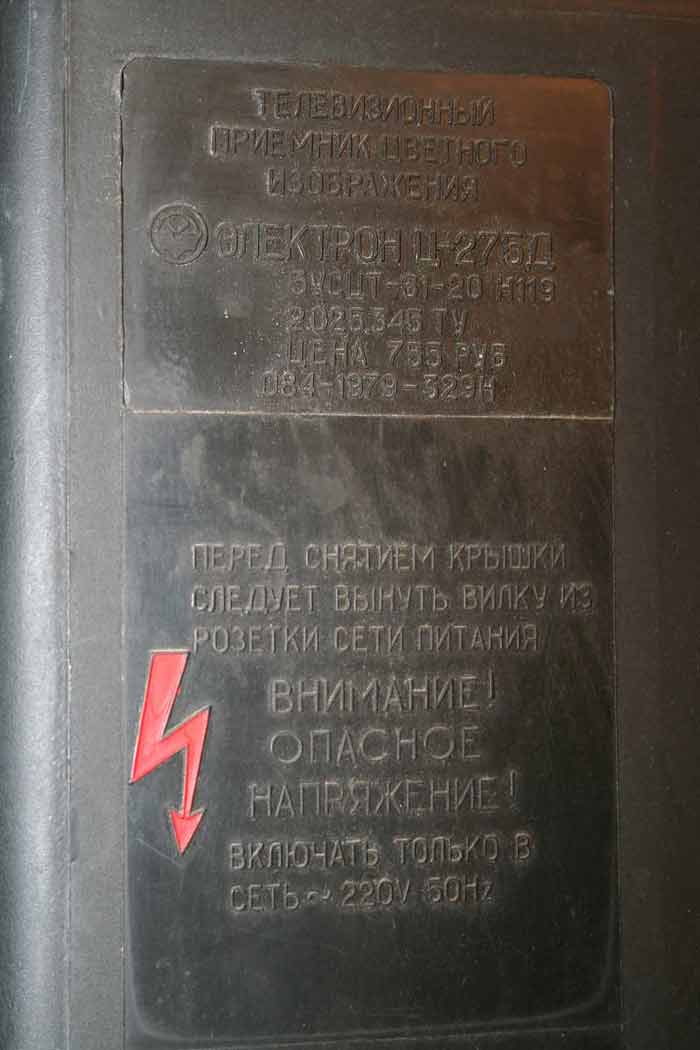 Телевизионный приёмник цветного изображения *Электрон Ц-275/Д* с начала 1982 года выпускал Львовский телевизионный завод. *Электрон Ц-275/Д* - полупроводниково-интегральный цветной телевизор кассетно-модульной конструкции на основе моношасси с 5 модулями: радиоканала, цветности, строчной и кадровой разверток, питания. Кинескоп типа 61ЛК4Ц с углом отклонения лучей 90° (наличие блока сведения). Сенсорное устройство выбора программ с индикацией. Приём в диапазоне МВ. Телевизоры с индексом *Д* работают в диапазонах МВ и ДМВ. Есть гнёзда для магнитофона, головных телефонов. Бестрансформаторный БП позволяет эксплуатировать телевизор без стабилизатора. Корпус облицован декоративной отделочной пленкой или шпоном ценных пород древесины с покрытием полиэфирным лаком. Потребляемая мощность 120 Вт. Габариты телевизора 495х748х550 мм. Масса 37 кг.