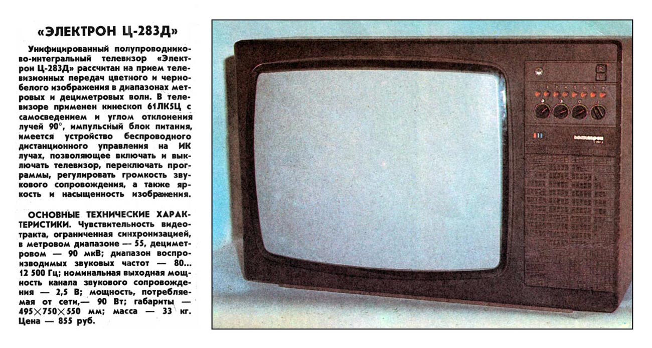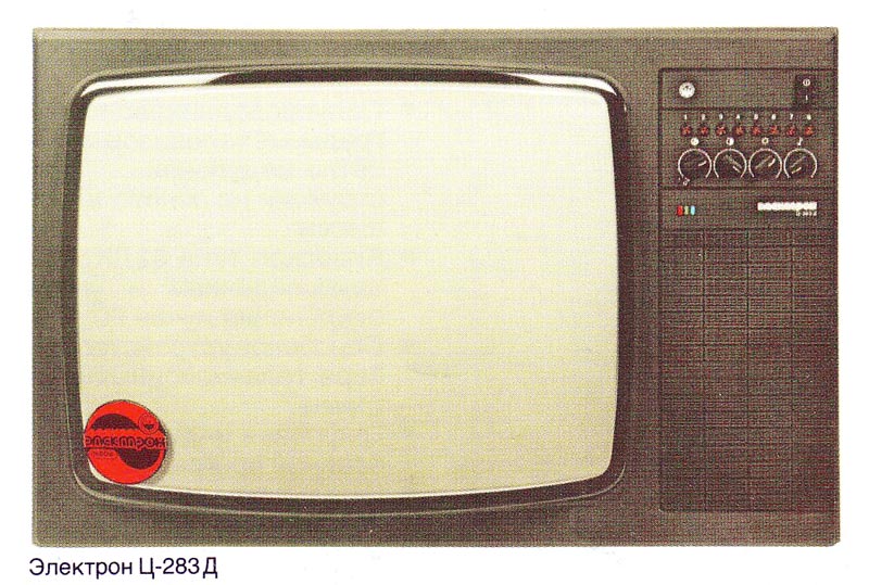 Телевизионный приёмник цветного изображения *Электрон Ц-283Д* и *Электрон Ц-383Д* с 1988 года выпускало Львовское ПО *Электрон*. Модели предназначены для приёма цветных и ч/б программ в диапазонах МВ и ДМВ. В обоих телевизорах применены: кинескоп с самосведением лучей и углом отклонения лучей в 90 градусов, 8-ми программное устройство выбора программ, импульсный БП, ряд автоматических регулировок, которые обеспечивают высокое качество изображения и звука при различных условиях приёма. Пульт ДУ на ИК лучах позволяет на расстоянии управлять настройками. Имеются разъёмы для подключения головных телефонов или магнитофона. Краткие технические характеристики моделей: Размер экрана по диагонали соответственно 61 и 51 см. Диапазон воспроизводимых звуковых частот 80...12500 и 100...10000 Гц. Номинальная выходная мощность канала звука 2,5 Вт. Потребляемая от сети мощность 80 и 60 Вт. Габаритные размеры 492х745х544 и 640х470х450 мм. Масса 27 и 37 кг.