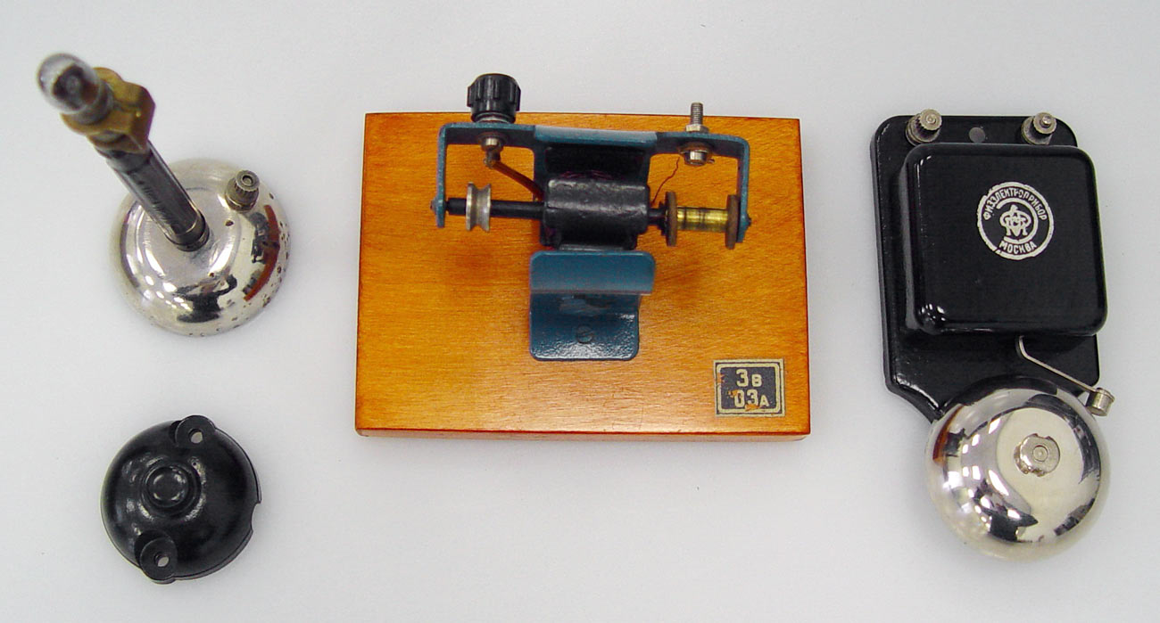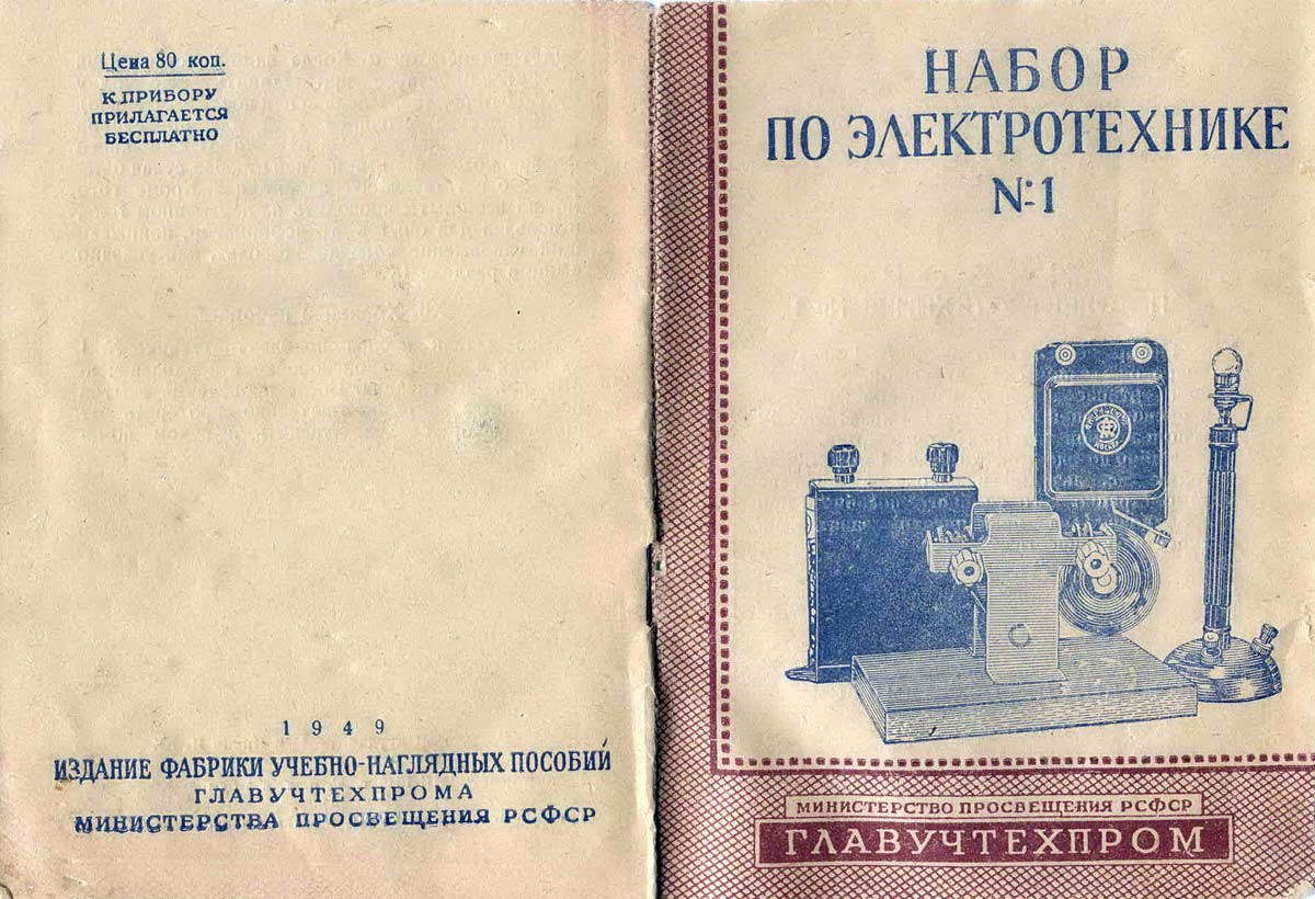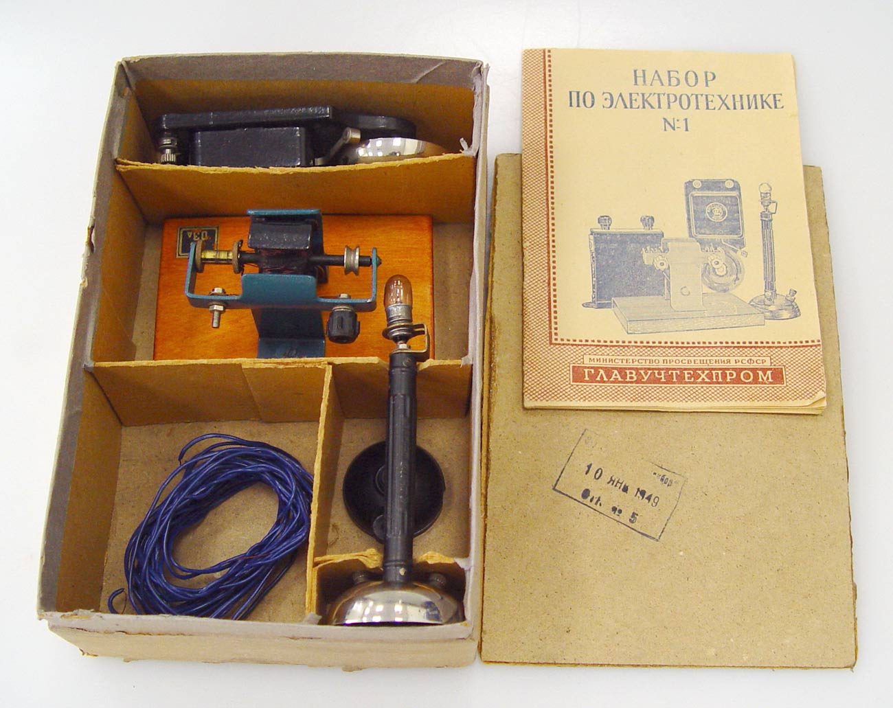 Набор по электротехнике №1 выпускался с 1949 года Московским заводом *Физэлектроприбор*. Набор предназначен для демонстрации нескольких электрических устройств, таких как настольная лампа, выключатель, электрический звонок и электродвигатель. Фото с сайта https://collectionerus.ru/.