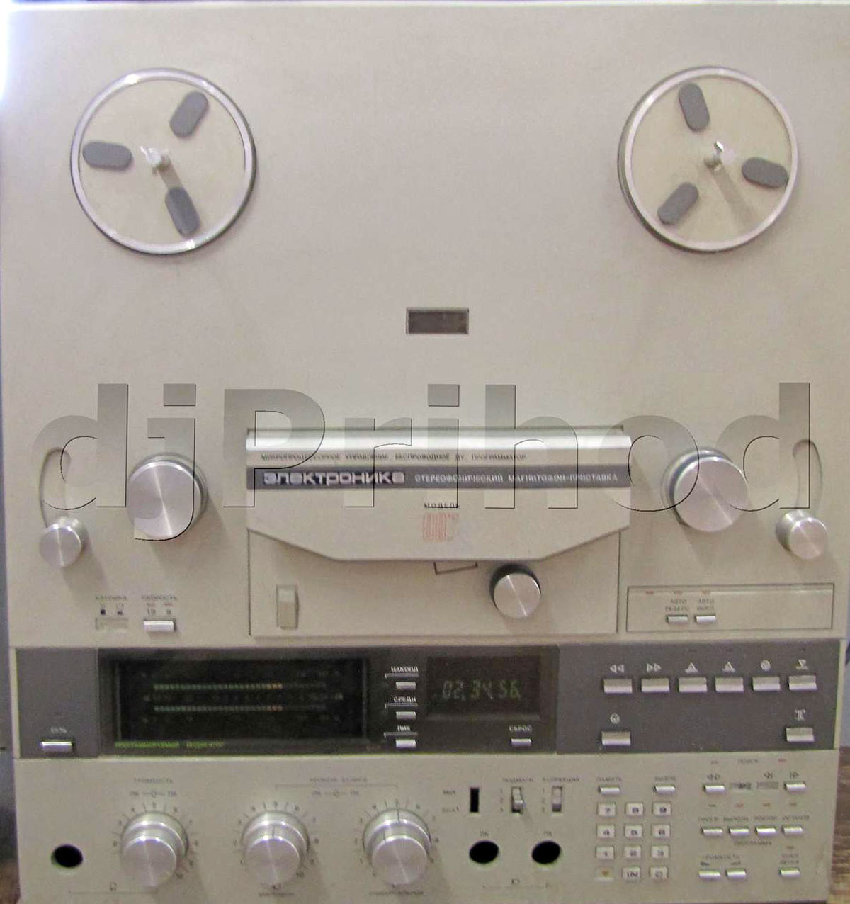 Стереофоническая катушечная магнитофонная приставка *Электроника-007* в начале 1987 года была подготовлена к выпуску Фрязинским заводом *Рений*. В МП с помощью восьмиразрядной разрядной микро ЭВМ реализовано свыше 70 функций, основными из которых являются: программирование воспроизведения фонограмм по электронному счетчику или по их порядковым номерам с возможностью повторения программ; автопоиск; возможность обзора записанных на ленте фонограмм; возможность коррекции АЧХ и уровня тока подмагничивания в зависимости от типа магнитной ленты; автовыключение магнитофона от сети; отображение информации на многоцветном дисплее. В МП имеется корректировка фазовых искажений при воспроизведении и полуавтоматическая регулировка уровня записи, улучшающие качество фонограмм. Пульт дистанционного управления на инфракрасных лучах позволяет на расстоянии до 8 метров пода вать команды, реализующие более 25 режимов работы, включая и программирование воспроизведения. Скорость движения магнитной ленты 19,05 см/с и 9,53 см/с. Диапазон записываемых или воспроизводимых частот на скорости 19,05 см/с 20...25000 Гц. Коэффициент детонации на скорости 19,05 см/с ±0,08%. Уровень шумов и помех -62 дБ. КНИ 1,2%. Относительный уровень стирания -70 дБ. Габаритные размеры магнитофонной приставки - 495x440x240 мм. Её масса 24 кг.