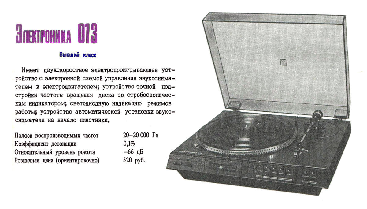Электропроигрыватель высшего класса *Электроника-013* подготовил к выпуску с 1983 года Брянский завод технологического оборудования.