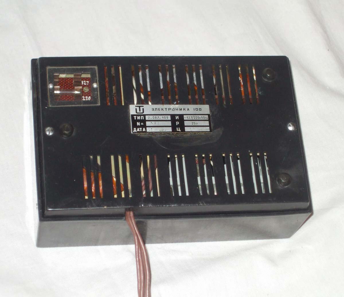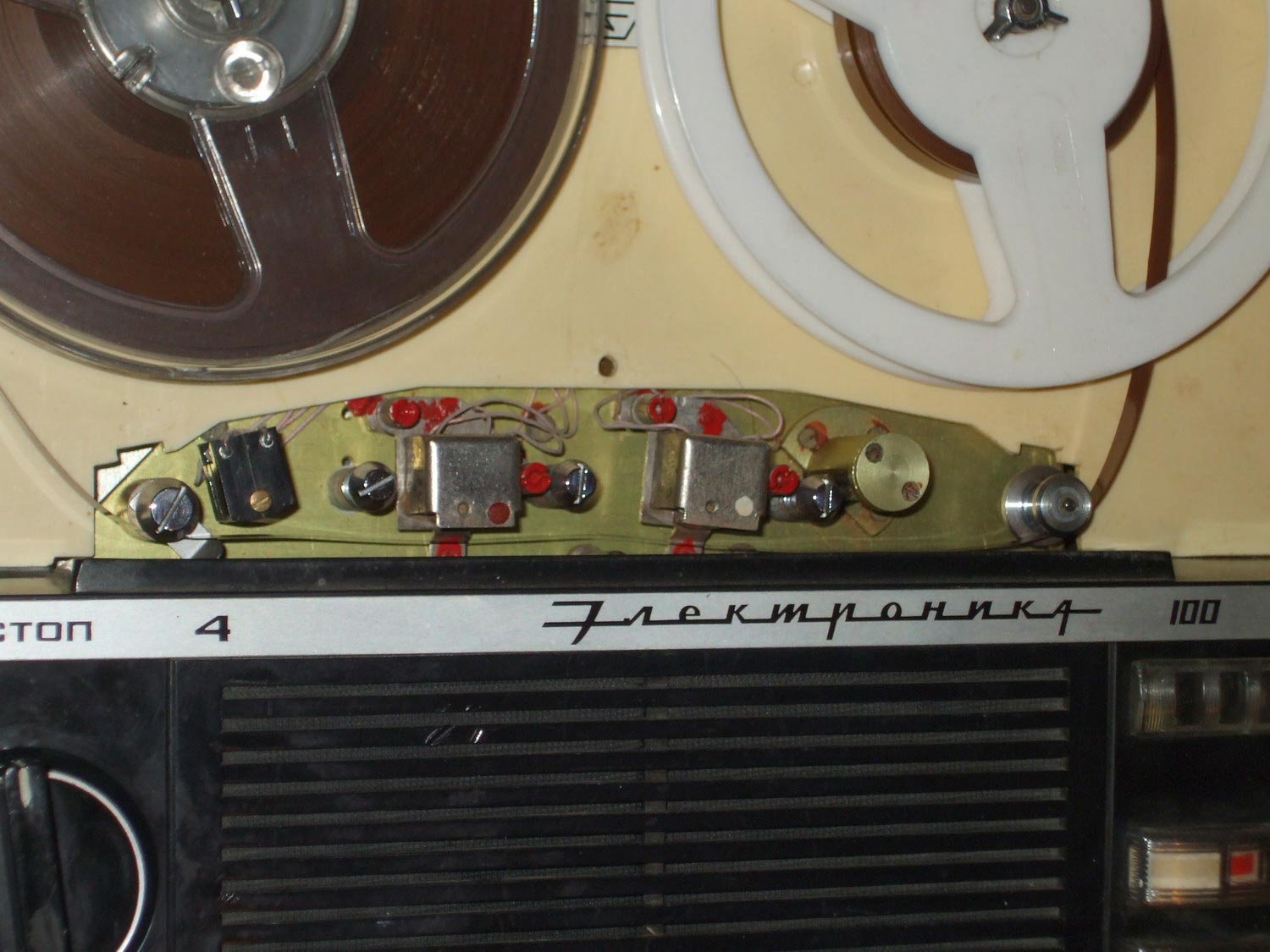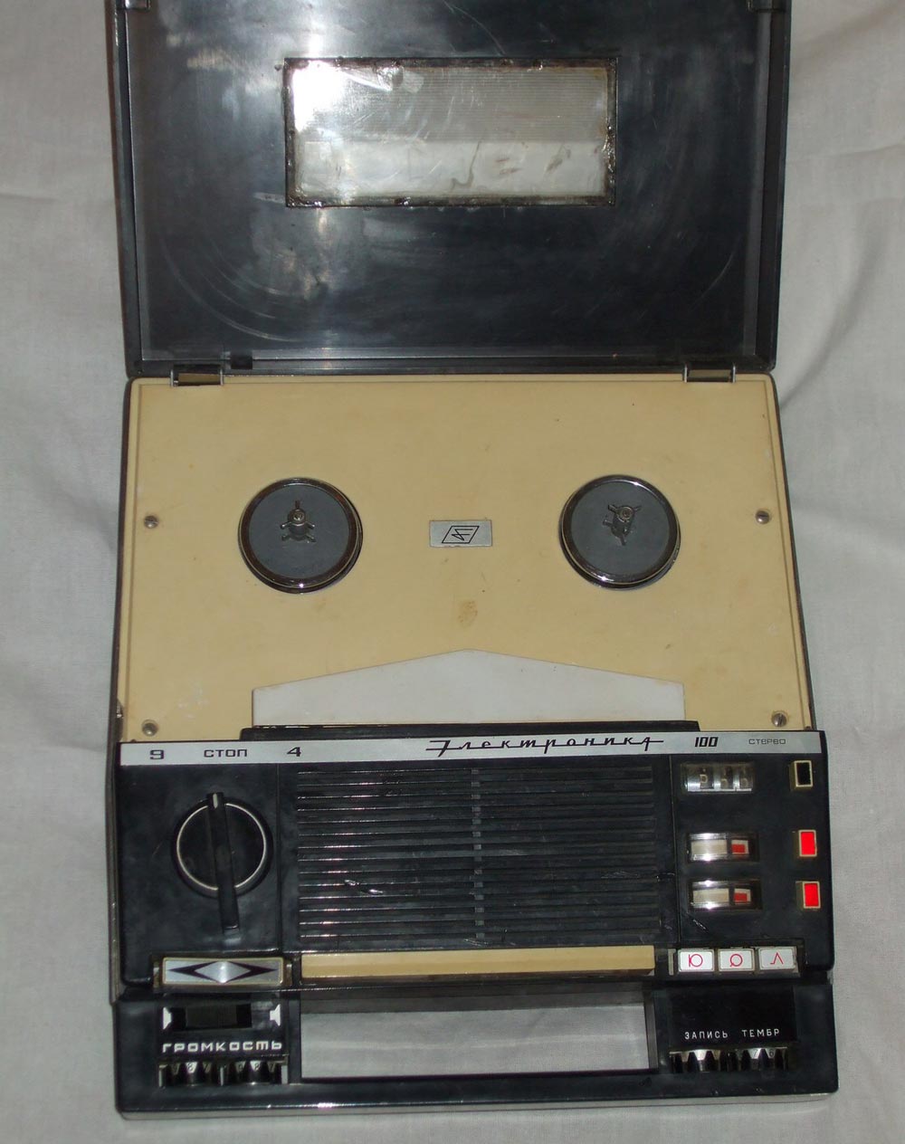 Переносной катушечный магнитофон *Электроника-100-стерео* с 1970 года выпускал Учкекенский завод *Элия*. Магнитофон выпущен малой серией к 100-летию со дня рождения В.И.Ленина. Предназначен для записи и последующего воспроизведения звуковых фонограмм. Скорости протяжки ленты 4,76 и 9,53 см/сек. Первая скорость 4,76 см/сек предназначена для записи речи. Магнитофон имеет функции: записи моно или стереофонических фонограмм; записи фонограмм в режиме моно на любую из 4 дорожек; записи одновременно на 2 дорожки; прослушивание фонограммы в процессе записи; одновременной записи на одну и прослушивание другой дорожки в моно режиме; ускоренную перемотку ленты в обе стороны. В магнитофоне имеется регулировка тембра ВЧ. Диапазон записывемых и воспроизводимых частот (на линейном выходе) не уже: на скорости 4,76 см/сек - 80...6000 Гц; 9,53 см/сек - 50...14000 Гц. Диапазон частот по звуковому давлению на собственных АС на большей скорости 100...10000 Гц. В модели имеется контрольный громкоговоритель, который воспроизводит полосу частот 200...8000 Гц. Номинальная выходная мощность на внешние АС - 1 Вт, на громкоговоритель 0,25 Вт. Питание от батарей А-373 или от выносного стабилизированного БП.